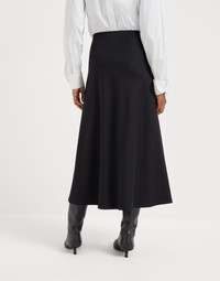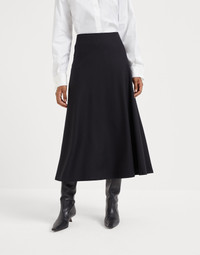 An elegant, essential aesthetic defines the style of this Flute skirt in stretch virgin wool twill. The garment’s smooth, fluid texture highlights the tapered, feminine silhouette. The design continues with volume at the bottom for a slightly flared effect. MATERIALS The virgin wool twill combines the characteristic diagonal structure with the fine, fluid texture of the natural fiber. The small percentage of synthetic fiber makes the garment extraordinarily comfortable to wear. DETAILS Pull-up skirt Silk-blend crêpe lining 95% VIRGIN WOOL, 5% ELASTANE
