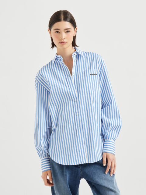 Refined details update the classic masculine feel of striped patterns in this new striped cotton poplin shirt. The style features soft proportions with generous sleeves that form a light balloon effect, creating a very feminine silhouette. A precious detail completes the garment with a sparkling touch: the chest pocket is enriched with a small tag embroidered with rows of shiny monili, the iconic embellishment of the Brunello Cucinelli collections. MATERIALS A classic fabric of the Brunello Cucinelli collections, the pure cotton poplin is delivered in a striped version that uses the season’s colors to update the classic menswear pattern in a feminine way. DETAILS Button fastening with placket Classic collar Patch chest pocket Cuffs have one mother of pearl button Nickel-free monili decoration 100% COTTON