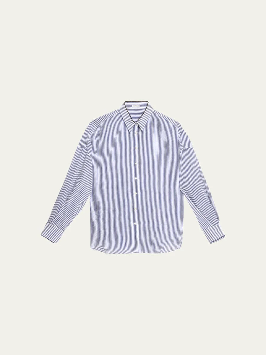 Brunello Cucinelli stripe shirt with piped collar Spread collar; button front Long sleeves; button cuffs Back yoke; box pleat Oversized fit Linen/silk Dry clean Made in Italy