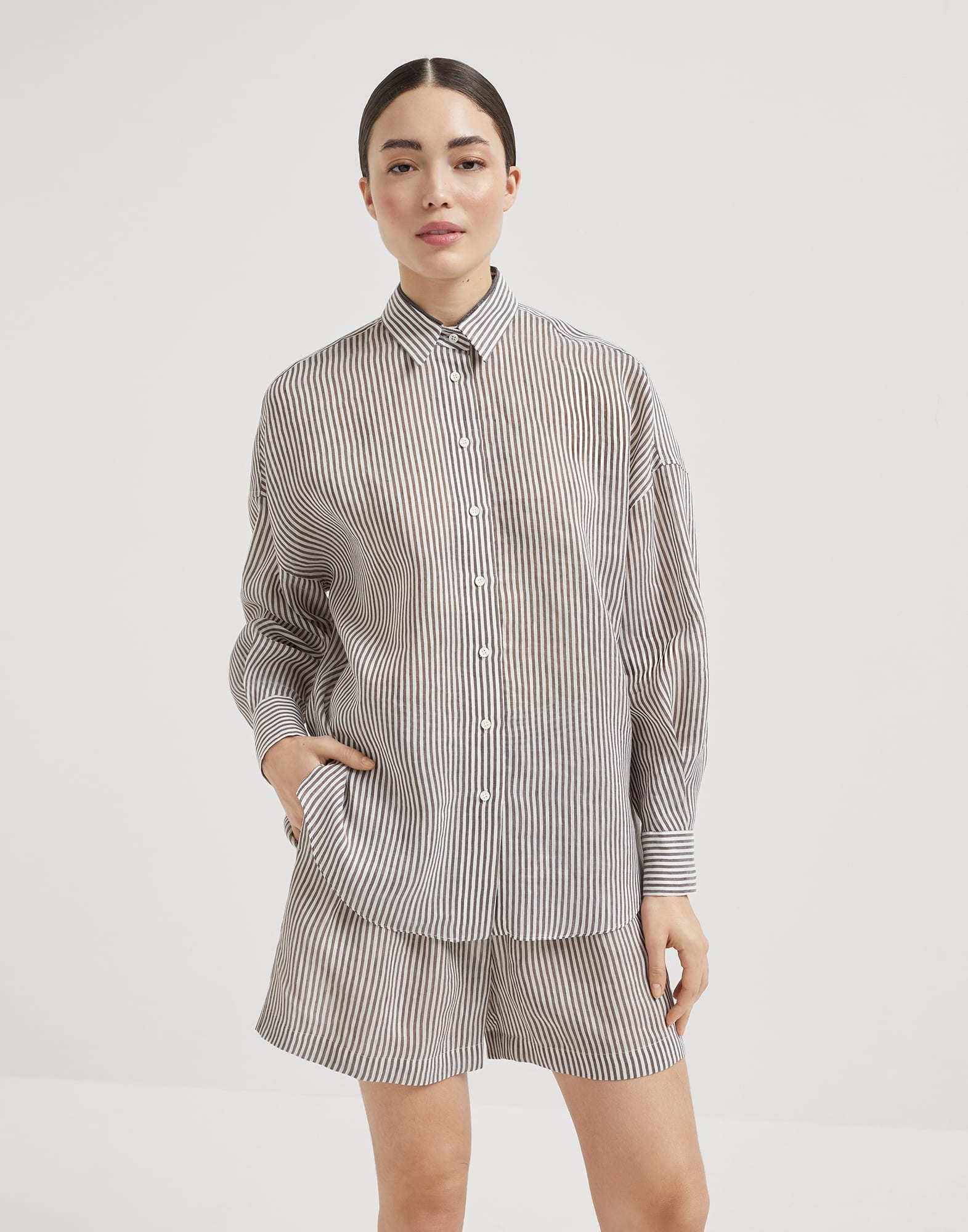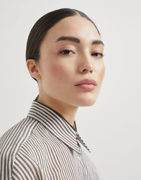 Versatile style and refined details come together in this new linen and silk organza shirt. The casual striped pattern runs along the garment’s elongated silhouette, characterized by relaxed, fluid lines. The collar’s precious monili edge illuminates the shirt with a touch of radiant sparkle. MATERIALS Ultra-lightweight and semi-transparent, the refined linen and silk organza is a fabric with an extremely crisp, dry hand, making it perfect for the summer months. DETAILS Classic collar Cuffs have one mother of pearl button Nickel-free monili decoration 78% LINEN, 22% SILK