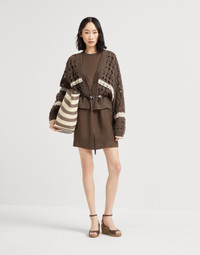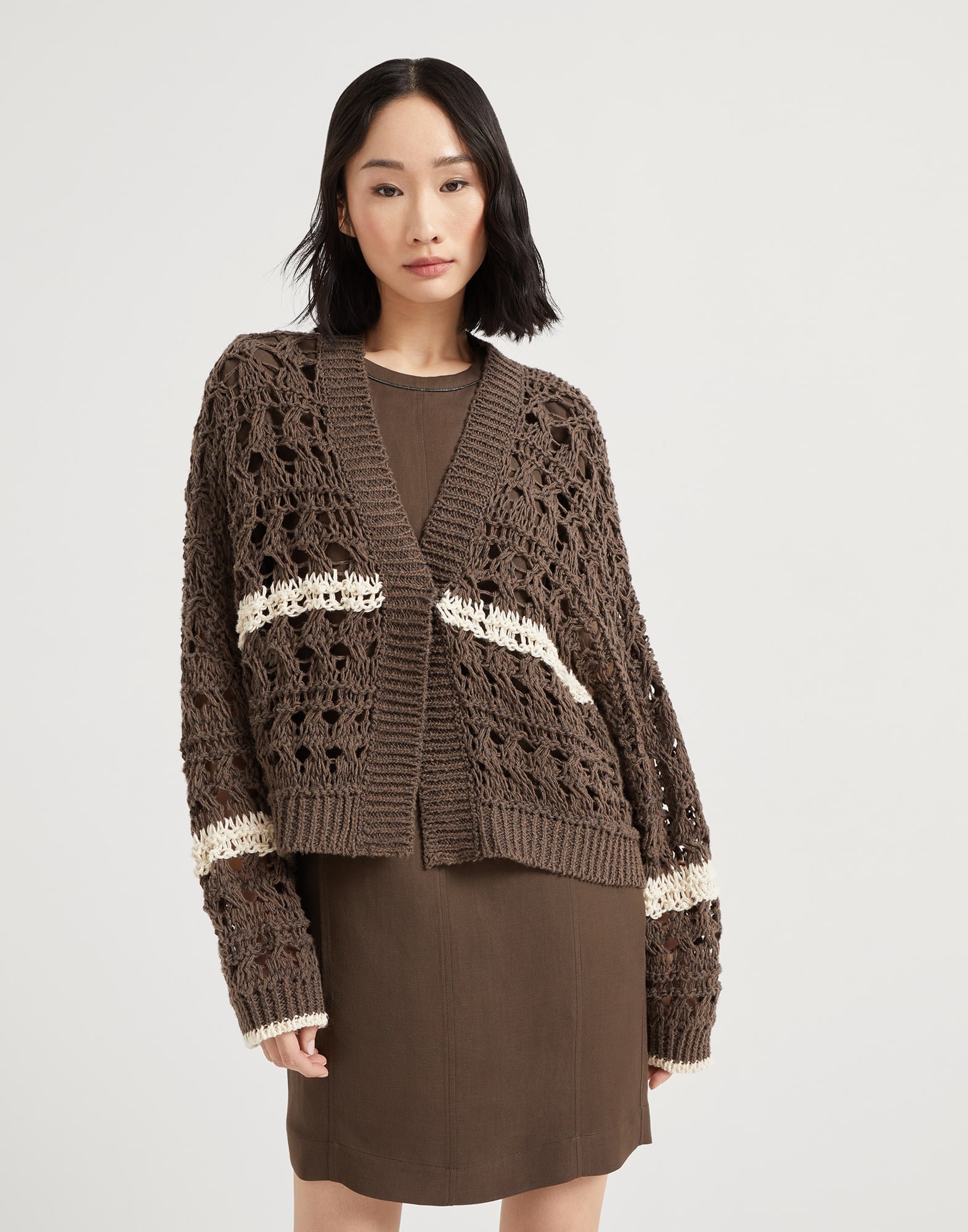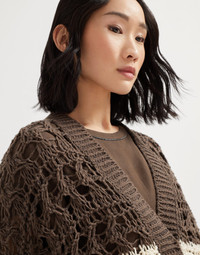 Made of natural jute and cotton fibers, this cardigan is defined by the authentic allure of its refined textured net knitting. The sophisticated net stitch plays with solid and empty spaces with a three-dimensional appearance, enhancing the design’s lightness. The relaxed silhouette offers wide, comfortable proportions, emphasized by the dropped shoulders and generous sleeves. The concealed button closure adds a functional element and an essential appearance. MATERIALS With a light, soft texture, the yarn is defined by the blend of jute and cotton fibers. A small percentage of a synthetic fiber guarantees the yarn’s durability and structure. DETAILS Horn button closure V-neck Drop shoulder Wide sleeve Net knitting 55% JUTE, 35% COTTON, 10% NYLON