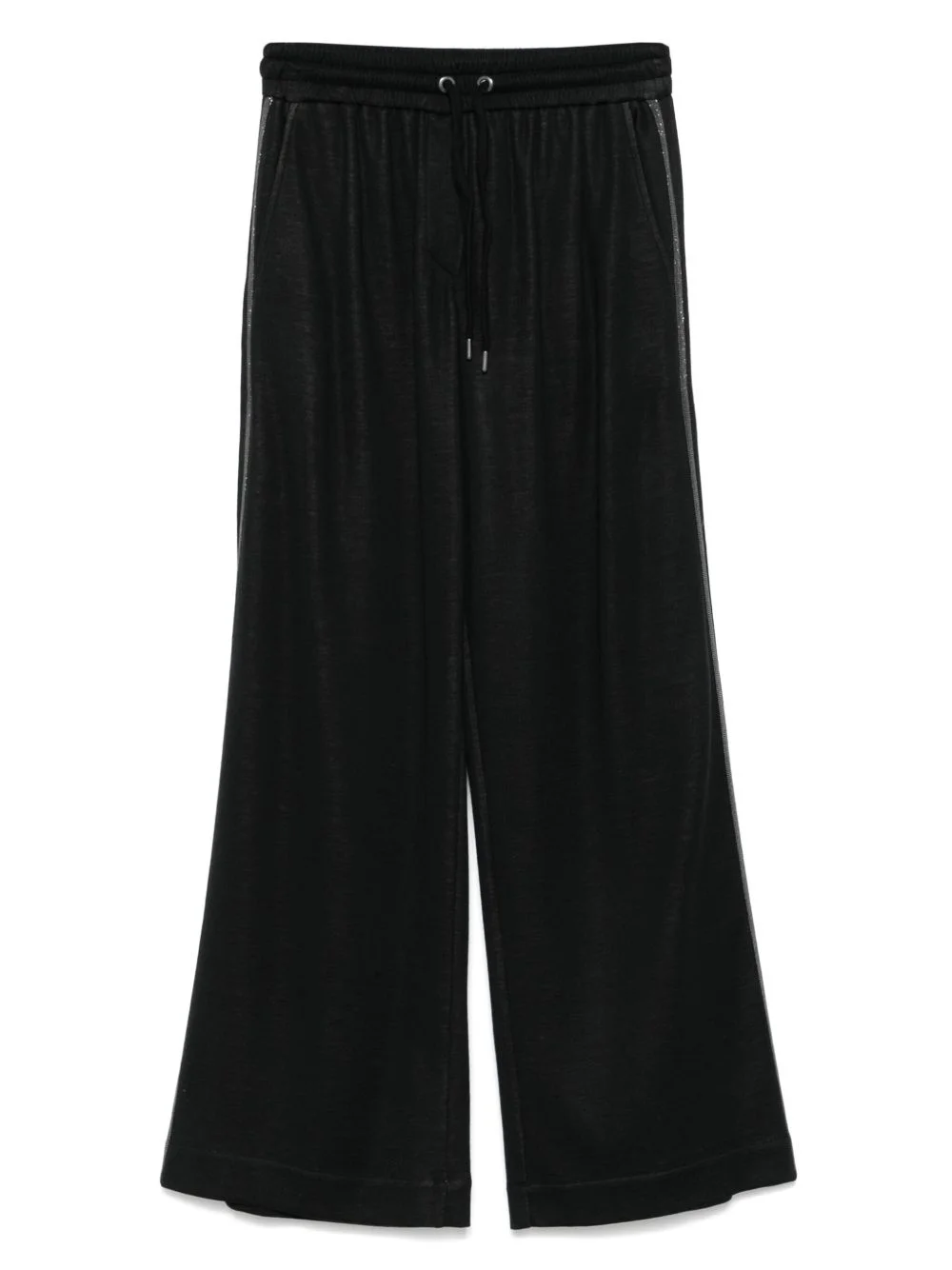 stripe-detail trousers Highlights - Black - Elasticated drawstring waistband - Two side slash pockets - Two rear jetted pockets Made in Italy Composition Outer: Cotton 67%, Silk 31%, Polyamide 2% Lining: Acetate 74%, Silk 26% SIZE & FIT Model measurements Height 5 ft 10 in(1.79 m) Bust/Chest 33.07 in(84 cm) Hips 35.82 in(91 cm) Waist 24.01 in(61 cm) FittingInformation Designed for a straight-leg fit, these trousers allow for a close fit at the waist and an unrestricted, comfortable fit over the leg Made from a midweight non-stretch fabric