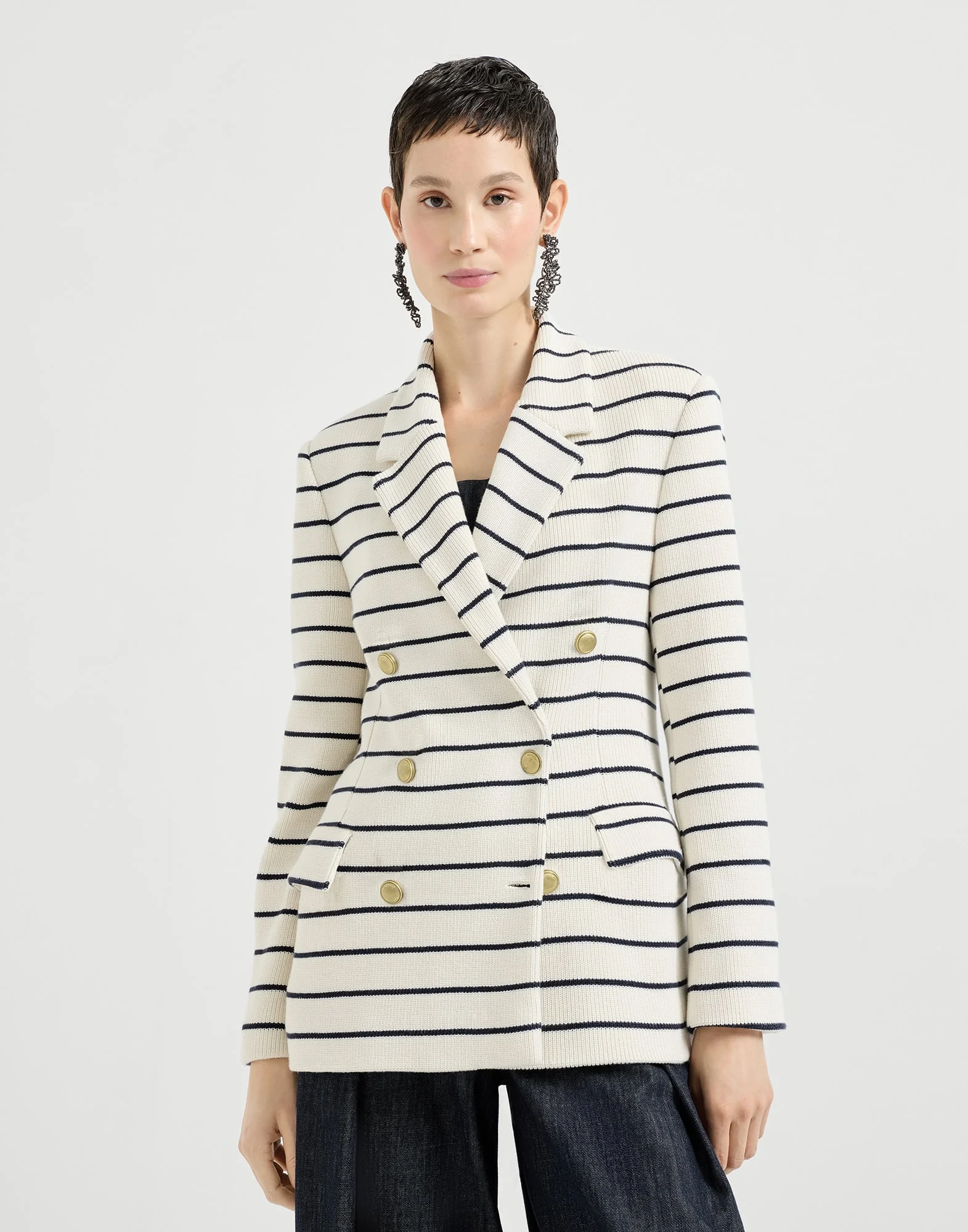 The world of knitwear is paired with tailored style in this cotton striped knit blazer. The classic workmanship perfectly complements the classic lapels and double-breasted closure, while the striped pattern elegantly evokes an iconic nautical charm. The clean, essential cut defines a feminine silhouette, which is slightly fitted at the waist to enhance the figure. A fine shiny monili embroidery completes the blazer with a radiant sparkling note in true Brunello Cucinelli style. MATERIALS The cotton yarn is soft, lightweight and breathable, making it ideal for the warmer seasons. The knitting enhances the natural texture of the material, providing a compact yet comfortable hand and a clean, refined appearance. DETAILS Metal button closure Notched lapel Cuffs have four metal buttons Hand pockets with flap Silk-blend crepe lining Nickel-free monili decoration 100% COTTON