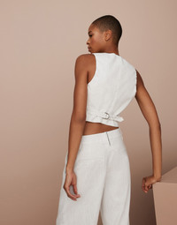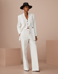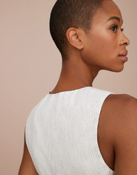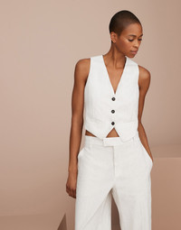 Feminine fabrics update the tailored inspiration of this striped linen and cotton waistcoat in a contemporary way. An embroidery behind the neck in monili, the iconic embellishment of the Brunello Cucinelli collections, enriches the garment with an sophisticated sparkling note. The lining provides the fit with added comfort. The waistcoat can be matched with the blazer and trousers made in the same fabric to create an elegant Coordinated Set. MATERIALS The striped fabric is characterized by the contrast between the linen’s slubbed texture and the softness of cotton. A small percentage of spandex provides added comfort. DETAILS Horn button closure Silk-blend crêpe lining Nickel-free monili decoration 54% LINEN, 45% COTTON, 1% ELASTANE