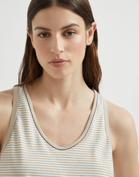 A sporty attitude and precious details come together in this striped cotton jersey top. The style showcases a striped pattern with a distinctly casual feel, while comfortable proportions make the garment very versatile. The iconic shiny monili embroidery frames the neckline for a feminine touch in true Brunello Cucinelli style. MATERIALS A classic striped pattern in seasonal shades enriches the soft cotton jersey, a lightweight fabric with a smooth and flowing hand. DETAILS Wide neckline Off-the-shoulder style 100% COTTON