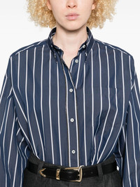 striped button-down shirt Highlights - Blue - Vertical stripes - Button fastening - Long sleeves - Curved hem - Single breast pocket Made in Italy Composition Eco Brass 100%, Cotton 81%, Silk 19% SIZE & FIT Model measurements Height 5 ft 9 in(1.75 m) Bust/Chest 34.64 in(88 cm) Hips 36.61 in(93 cm) Waist 26.37 in(67 cm) Washing instructions Hand Wash