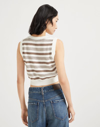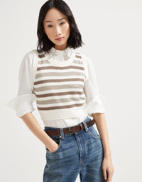 Sophisticated details and a casual attitude define the style of this knit top in striped cotton Sparkling yarn. The sporty garment is enriched with a striped pattern that pairs the season’s colors with a lame thread, elegantly playing with sparkle and texture. An embroidery of rows of shiny monili, the iconic element of the Brunello Cucinelli collections, completes the top. MATERIALS Fresh, lightweight and also comfortable, the pure cotton yarn offers the right amount of protection, particularly during the transitional months and warm weather. DETAILS Crew-neck Off-the-shoulder style English rib Nickel-free monili decoration 100% COTTON