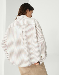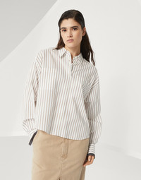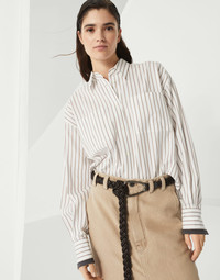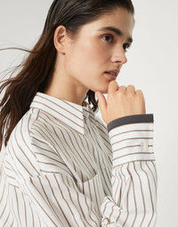 A precious embellishment enriches this striped cotton twill shirt, an essential womenswear piece. The monili detail, the iconic element of the Brunello Cucinelli Collections, decorates the cuffs with a sparkling note. The "cropped" silhouette features relaxed proportions, with slightly dropped shoulders and generous sleeves. MATERIALS Cotton twill is an ideal fabric for the summer season, thanks to its light, even texture and dry hand. DETAILS Classic collar Two chest pockets Cuffs have one mother of pearl button Nickel-free monili decoration 100% COTTON