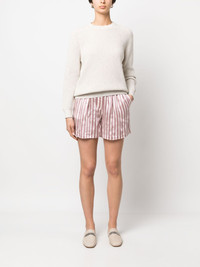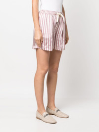 striped drawstring mini shorts Presented in rosewood pink and cream white hues, Brunello Cucinelli's mini shorts are crafted from a silk blend with a lightweight construction. Featuring an elasticated drawstring waistband, the pair boasts a vertical stripe print all over. Highlights - Rosewood pink/cream white - Silk blend - Vertical stripe print - High waist - Elasticated drawstring waistband - Two side slit pockets - Straight hem Made In Italy Composition Viscose 86%, Silk 14% SIZE & FIT Model measurements Height 5 ft 11 in(1.8 m) Bust/Chest 31.49 in(80 cm) Hips 35.43 in(90 cm) Waist 24.4 in(62 cm) Measurement FRONT RISE 11.41 in(29 cm) HIPS 40.94 in(104 cm) FittingInformation Designed for a relaxed, roomy fit The elasticated waist allows for a comfortable fit Made from a lightweight non-stretch fabric This piece fits true to size – take your usual size Washing instructions Dry Clean Only