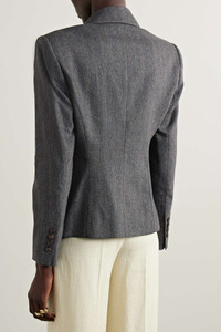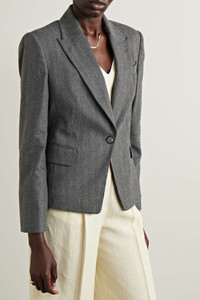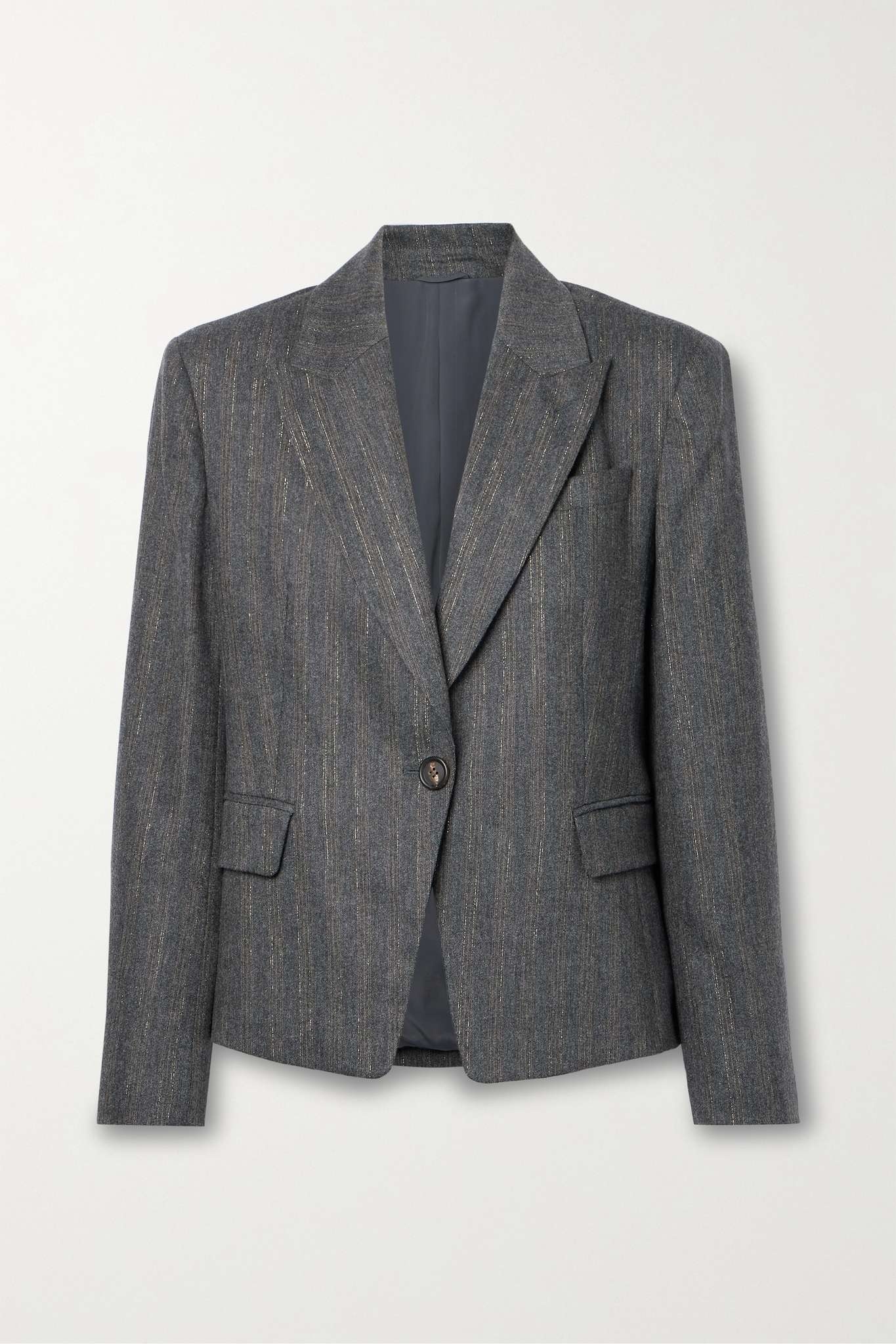 EDITORS'NOTES It's not immediately obvious, but Brunello Cucinelli's blazer is woven with gold threads that enhance the subtle stripes. It's been tailored in Italy from wool-blend and has peak lapels that draw the eye towards the padded shoulders and nipped-in waist. SIZE & FIT - Fits true to size, take your normal size - Those with broad shoulders may wish to take the next size up - Tailored for a slim fit - Mid-weight, non-stretchy fabric - Model is 180cm/ 5’11” and is wearing an IT 40 DETAILS & CARE - Dark-gray, brown and gold wool-blend - Button fastening at front - 43% wool, 42% virgin wool, 12% polyamide, 2% viscose, 1% polyester; button: 100% horn (Buffalo); lining: 74% acetate, 28% silk - Dry clean