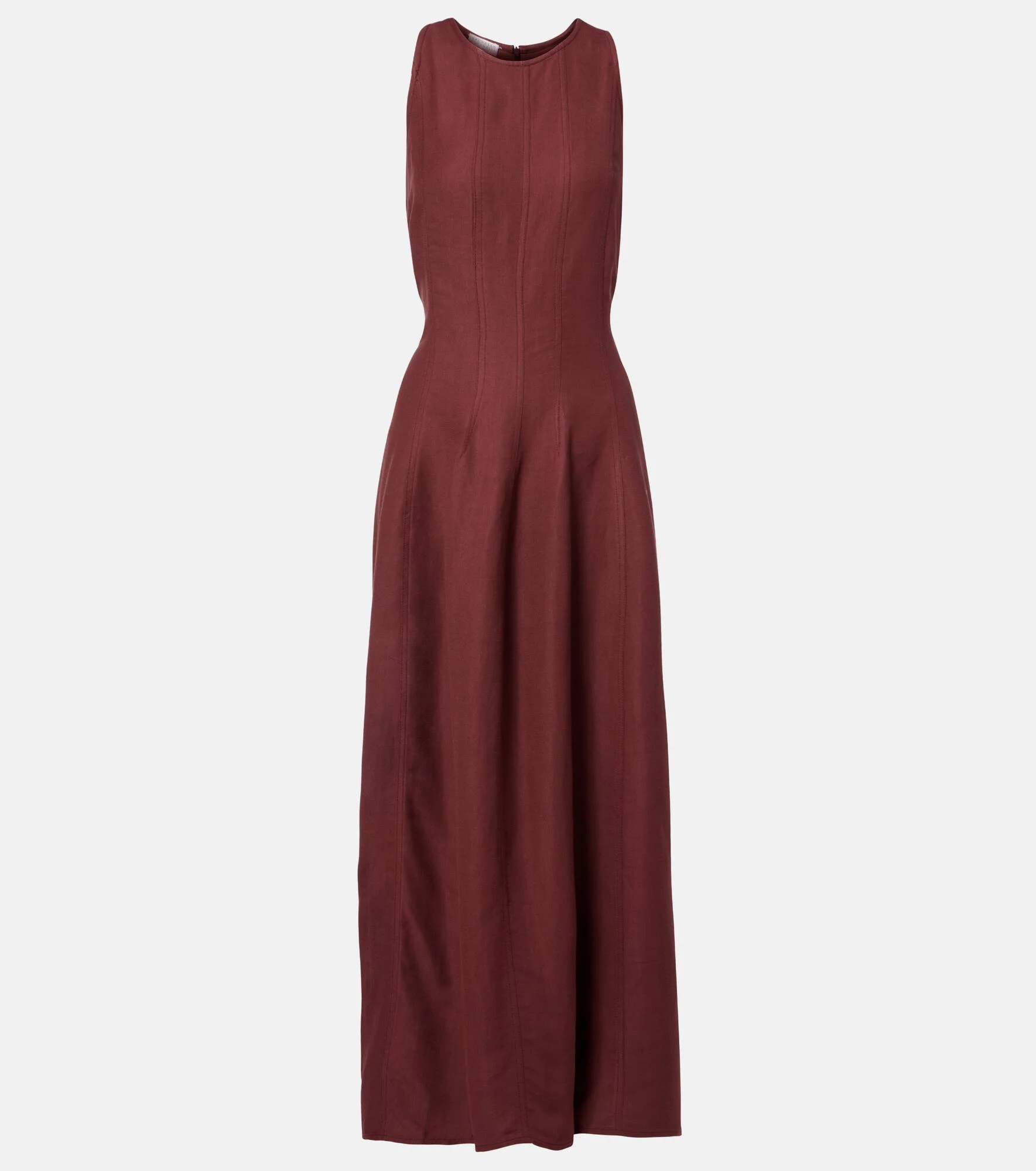 Brunello Cucinelli's designs are created in Solomeo, where art and traditions are woven into the house's every fiber. This midi dress is made from a lightweight fabric and features a subtly striped texture and a flared skirt. Product Details - Material: 72% viscose, 28% linen - Care instructions: dry clean - Made in Italy - Designer color name: Garnet - Item color: burgundy - Lining: 74% acetate, 26% silk - Closure: concealed zipped back - Item number: P01143574 Size & Fit - True to size - Cinched waist - Non-stretchy fabric - The model seen in the picture is 178cm-5'10" and wearing a size XS