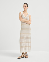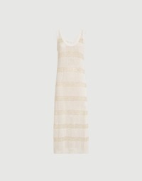 Timeless knitwear workmanship is updated in this cotton net knit dress with dazzling stripes. A classic net-like stitch creates an airy horizontal stripe pattern, embellished with an elegant sequin embroidery that spreads sparkling reflections throughout the garment’s surface. The close fit enhances the silhouette, giving the design a distinctly feminine allure. MATERIALS Fresh, lightweight and also comfortable, the pure cotton yarn offers the right amount of protection, particularly during the transitional months and warm weather. DETAILS Wide neckline Rib knit hem Net knitting Removable slip 100% COTTON