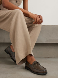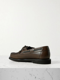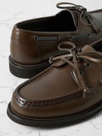 Brunello Cucinelli's boat shoes showcase exceptional Italian craftsmanship and leatherwork. They rest on rubber soles and are threaded with laces that are embellished with the signature Monili beads. Size & Fit - Fits true to size, take your normal size - Italian sizing Details & Care - Slight heel - Dark-brown leather (Calf) - Lace-up front - Designer color: Corvino