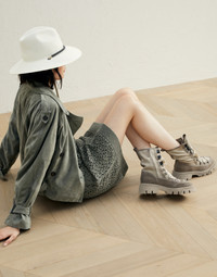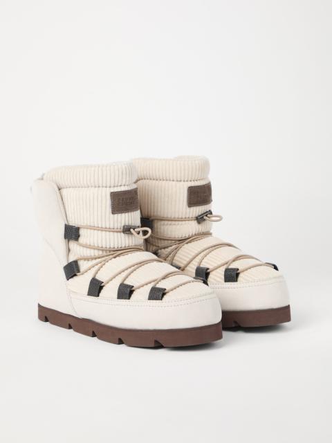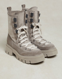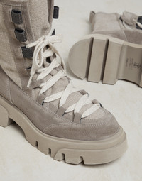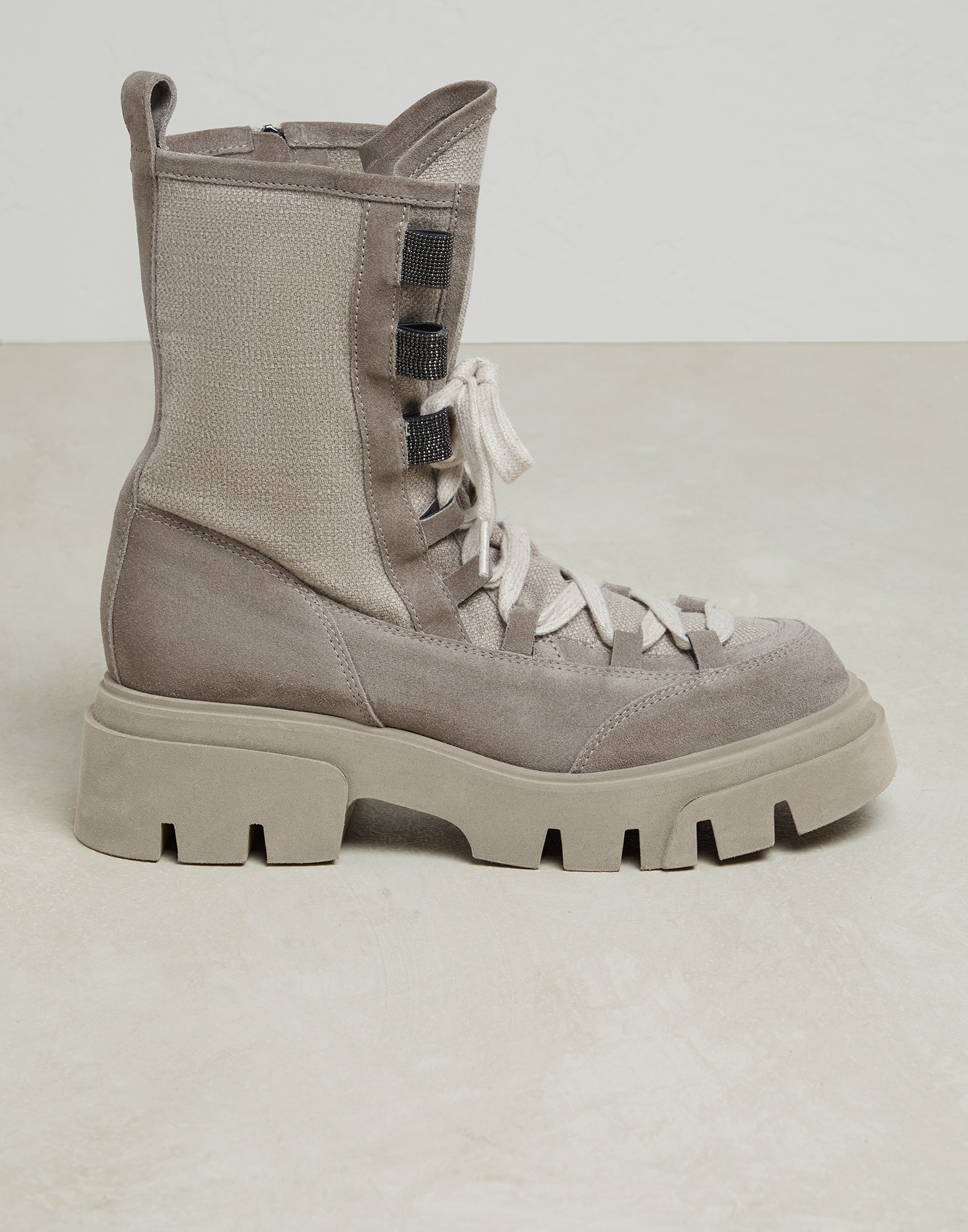 Precious details and “explorer” inspiration enhance these suede and canvas boots. The combination of the two materials introduces a sophisticated texture contrast, giving the footwear an elegant look. Covered in precious monili embroidery, the iconic embellishment of the Brunello Cucinelli collections enriches the wide hiking-inspired lace loops. The rubber lug outsole provides a bold touch, while accentuating the comfortable fit of the boots. MATERIALS Refined suede is a compact leather with a soft, velvety texture. A leather lining and a rubber outsole provide added comfort. DETAILS Internal side zip closure Leather lining TPU rubber tread Nickel-free monili decoration REAL LEATHER