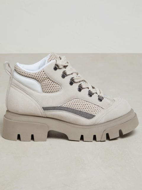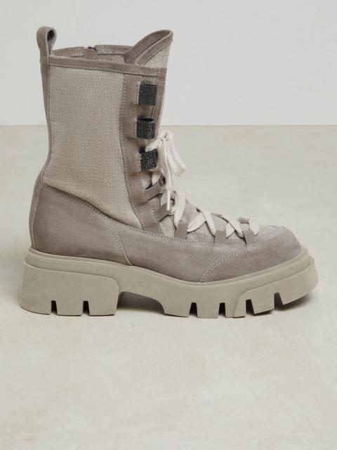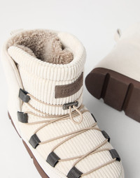 Refined material combinations and precious details enrich these new Mountain boots. Crossing elastic laces are showcased on timeless corduroy, bringing to mind a classic apres-ski look, reinterpreted in true Brunello Cucinelli style. At the same time, the velvety suede and the soft shearling lining create an alluring texture contrast with an exquisitely wintry feel. The shiny monili side loops complete the footwear with a note of feminine sparkle. MATERIALS The ribbing of cotton corduroy is paired with the very soft texture of suede. The plush shearling lining and rubber bottom ensure the footwear’s comfort. DETAILS Shearling lining Lightweight rubber outsole The heel height measures 2 cm (0,79") Nickel-free monili decoration REAL LEATHER