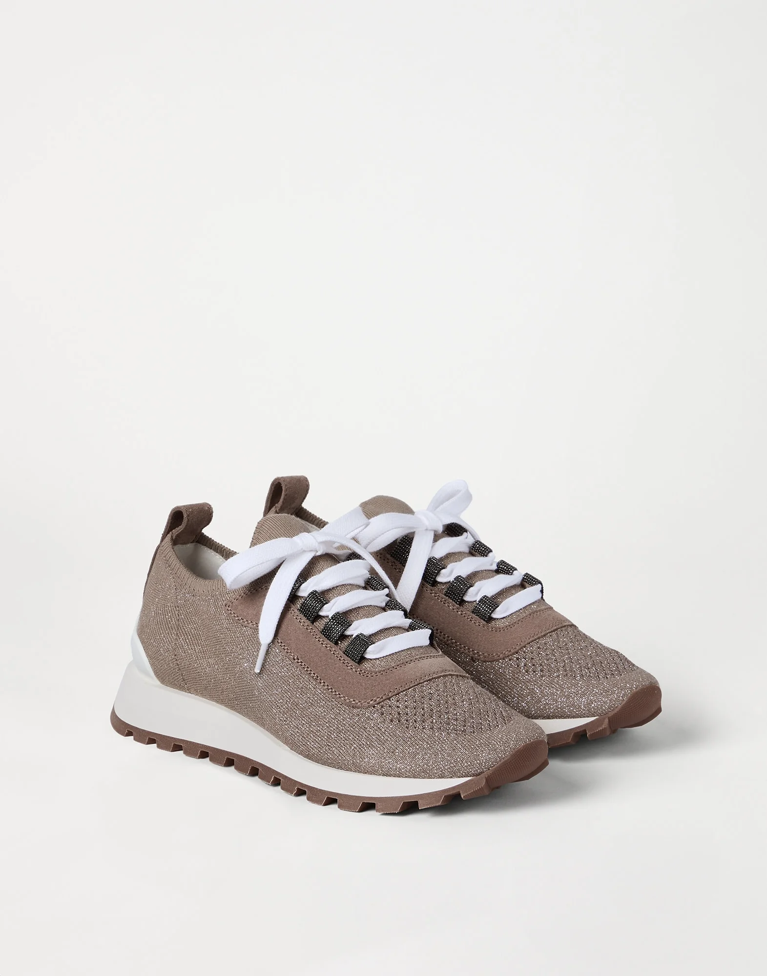 Refined texture contrasts and shiny embellishments enrich these suede and sparkling cotton knit runners. The upper combines the velvety touch of the leather and the freshness of the yarn, which enriches the footwear’s sporty style thanks to the shimmering reflections of the lame thread. The monili embroidered lace loops complete the look of the runners with a precious, feminine touch. MATERIALS The summery style of the fresh and shimmering sparkling cotton knit is paired with refined suede with a soft, velvety texture. The lightweight rubber outsole and tread provide the fit with added comfort. DETAILS Flat fabric laces Suede and fabric lining Sole in lightweight micro rubber TPU rubber tread Nickel-free monili decoration 55% COTTON, 35% VISCOSE, 10% POLYESTER