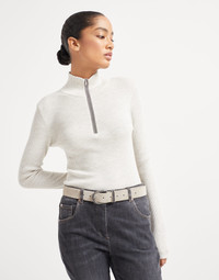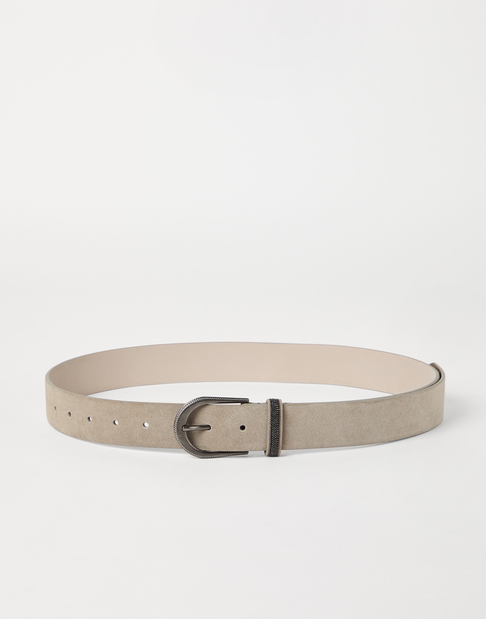 A modern silhouette and refined details characterize this new belt. Precious monili, the iconic embellishment of the Brunello Cucinelli collections, illuminates the edge of the buckle and the loop with a delicate feminine touch, pairing perfectly with the ultra soft, smooth texture of sueded calfskin. MATERIALS Sueded calfskin displays the characteristic velvety and slightly uneven texture. DETAILS Belt height approx. 3.5 cm (1,38") Nickel-free monili decoration 100% REAL LEATHER