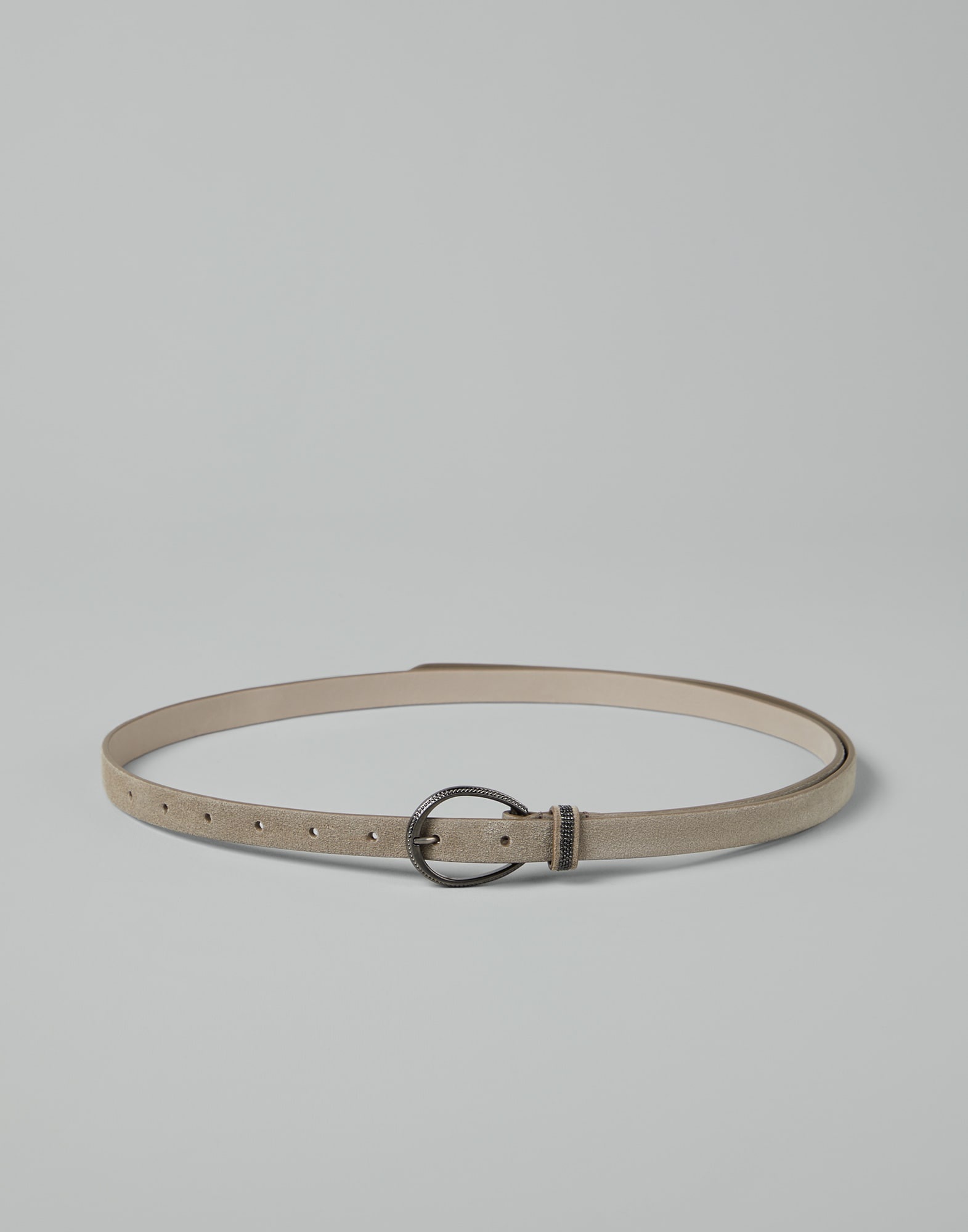 A retro-inspired detail and feminine embellishments define the style of this suede belt. The refined leather’s velvety texture is paired with the oversized oval shape of the buckle, while an embroidery made of fine rows of shiny monili illuminates the belt loop with a precious note in true Brunello Cucinelli style. MATERIALS Sueded calfskin displays the characteristic velvety and slightly uneven texture. DETAILS Belt height approx. 1,5 cm Leather lining Nickel-free monili decoration REAL LEATHER