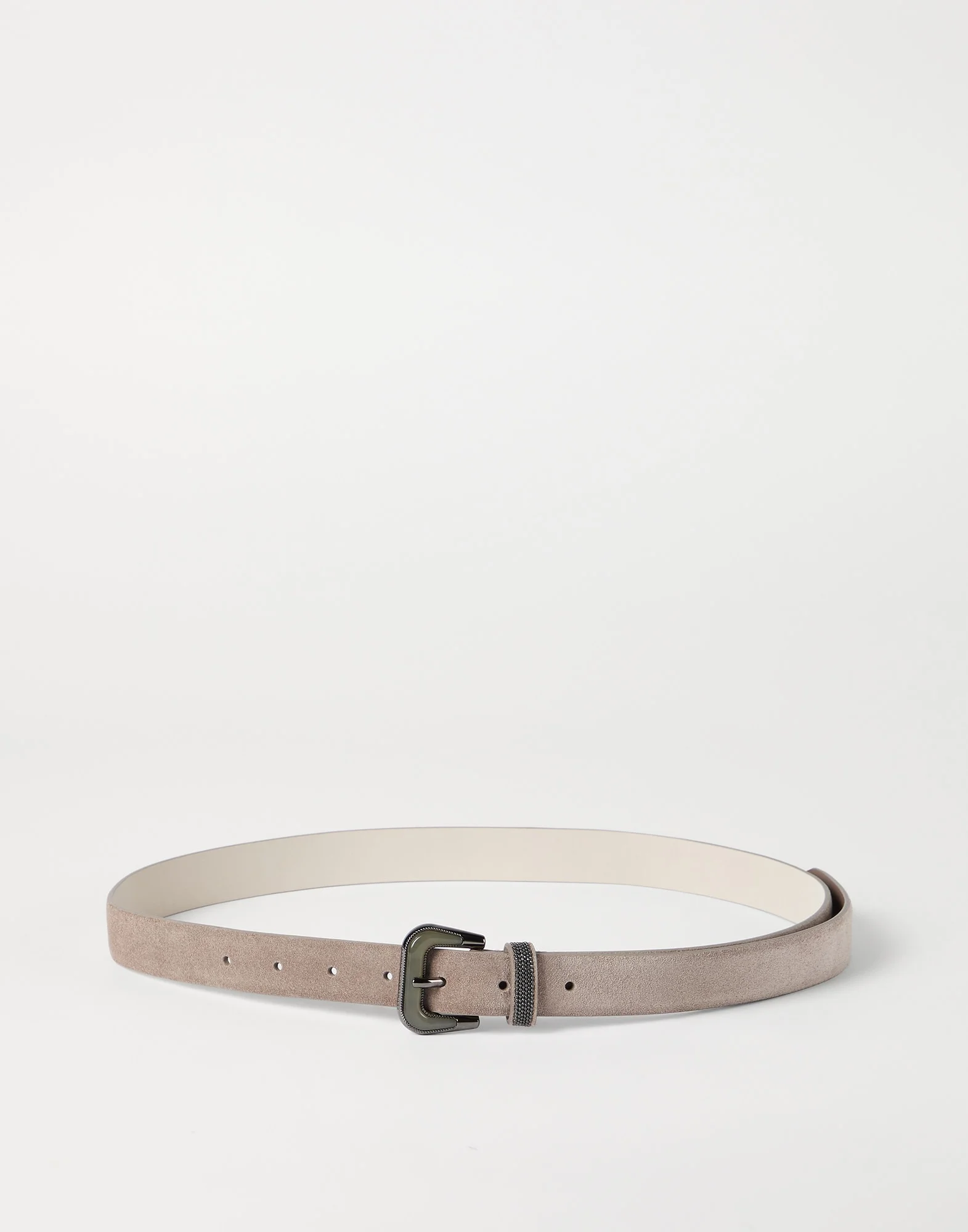 A classic yet contemporary style defines this suede belt. The refined leather provides the accessory with an elegant look and enhances the season's colors. The precious monili loops introduce a delicate texture contrast and add a sparkling note in true Brunello Cucinelli style. MATERIALS Sueded calfskin displays the characteristic velvety and slightly uneven texture. DETAILS Belt height approx. 2.5 cm (0.98") Nickel-free monili decoration 100% REAL LEATHER