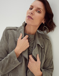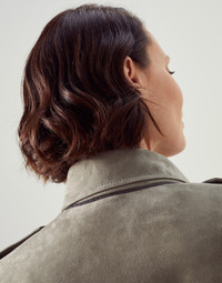 Refined Brunello Cucinelli materials enrich the sporty flavor of this Biker jacket, a menswear-inspired iconic style. The suede’s soft texture, dyed in a delicate color of the season, gives this garment a soft effect, while rows of shiny monili create a refined luminous stripe behind the neck. The zipper pockets and a silk-blend crêpe lining complete the style and comfort of this piece. MATERIALS Refined suede is a thin leather with a soft, velvety hand. DETAILS Two-way zip closure Silk-blend crêpe lining Lapel collar Hand pockets with zipper Nickel-free monili decoration REAL LEATHER