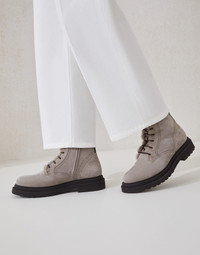 A contemporary design and feminine details define the elegant style of these new boots. Fine suede, with a soft and velvety hand, meets the plush shearling lining, highlighting the distinctly wintry feel of the design, characterized by the typical combat boot lace-up. A double loop on the back is illuminated with a shiny monili embroidery, the iconic embellishment of the Brunello Cucinelli collections. MATERIALS Refined suede is a thin leather with a soft, compact hand. The plush shearling lining and the lightweight micro outsole provide added comfort. DETAILS Round waxed fabric laces Internal side zip closure Shearling lining Sole in lightweight micro rubber The heel height measures 4 cm Nickel-free monili decoration REAL LEATHER