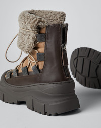The combination of refined materials enriches the outdoor inspiration of these Mountain boots. The upper alternates the smooth appearance of calfskin with the velvety texture of suede, while the soft look of the Curly shearling detailed in the shaft emphasizes the footwear’s distinctly wintry feel. The crossing elasticized closure highlights the sporty inspiration of the boots and is enriched with a shiny monili embroidery that illuminates the lace loops detail. MATERIALS The footwear combines the soft, velvety texture of suede with calfskin, characterized by a smooth, polished appearance. The Curly shearling insert showcases a textured effect, the result of a special finish that accentuates the material's full appearance. A leather lining and a rubber outsole provide added comfort. DETAILS Drawstring Back zip closure Leather lining TPU rubber tread Non-removable insert Nickel-free monili decoration 100% REAL LEATHER