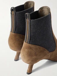 Brunello Cucinelli's elevated take on Chelsea boots is set on slanted 50mm heels for moderate lift. Made in Italy from velvety suede, they have comfortable elasticated panels and narrow squared toes. The signature Monili beads are arranged into a practical loop for easy on and off. Size & Fit - Fits true to size, take your normal size - Italian sizing Details & Care - Heel measures approximately 50mm/ 2 inches - Brown suede (Calf) - Pull on