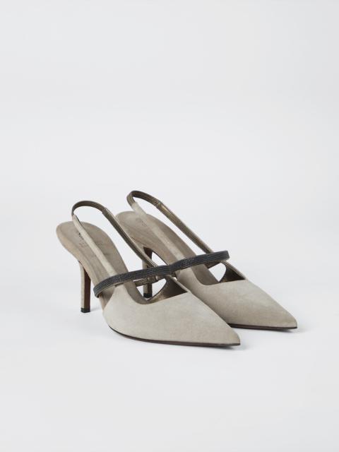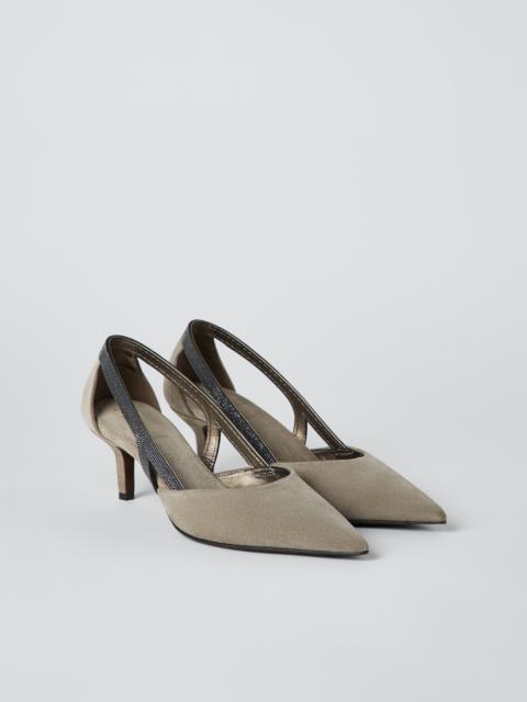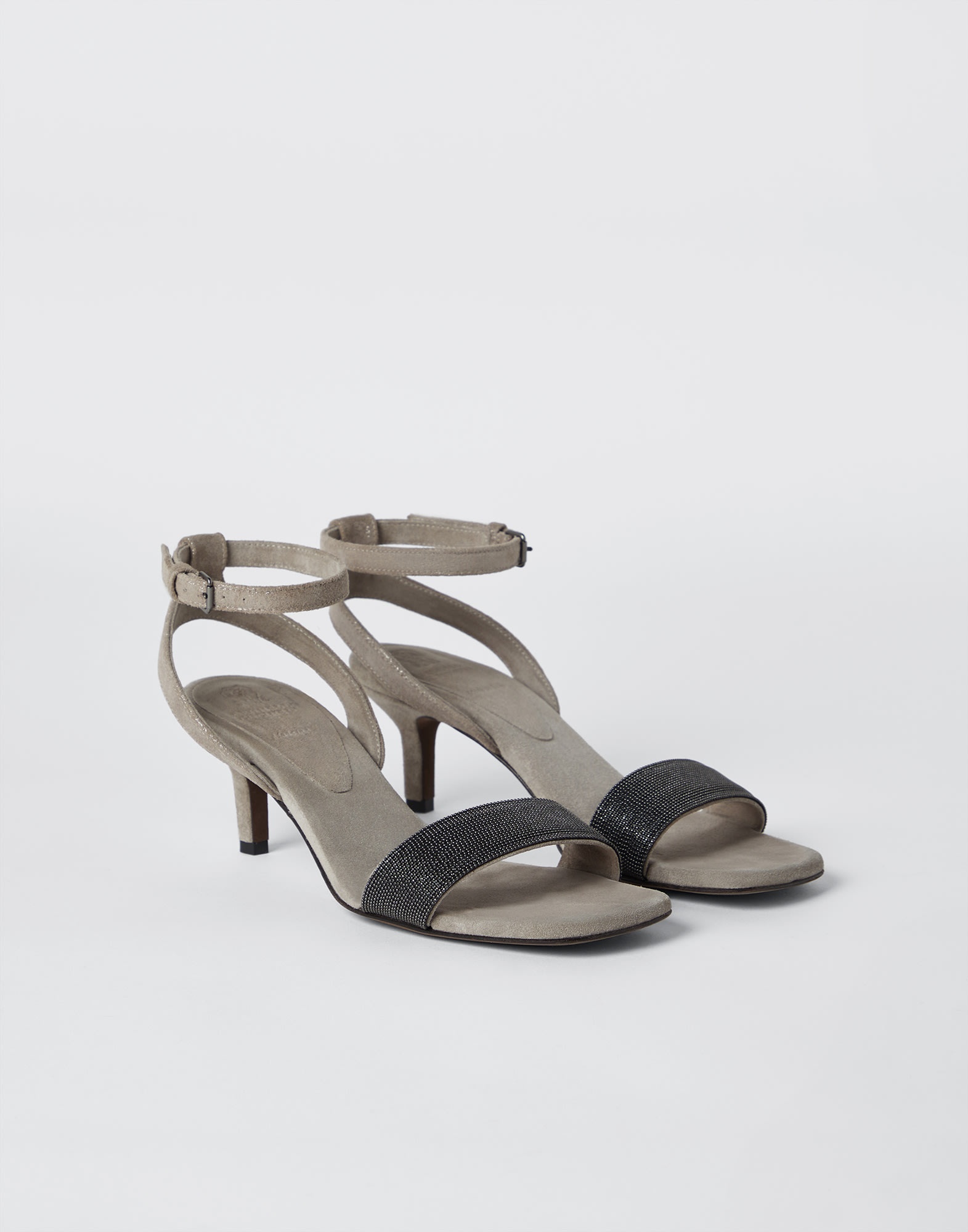 The excellence of Brunello Cucinelli materials elevates the contemporary style of these City heels. The soft, velvety texture of suede is paired with a front strap entirely embroidered in fine rows of shiny monili that enrich the footwear’s essential design with a precious, feminine note. MATERIALS Refined suede is a thin leather with a soft, velvety hand. The leather bottom with TPU rubber inserts provides added comfort. DETAILS Adjustable strap closure Leather lining Leather sole Non-slip TPU rubber at heel and toe 5.5 cm heel Nickel-free monili decoration REAL LEATHER