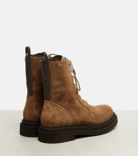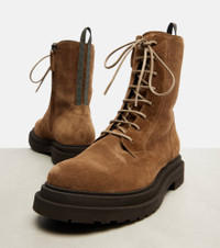 Crafted in Italy from suede, these combat boots from Brunello Cucinelli stand out for their lace-up shape. This pair features a zipper closure on the side and practical pull straps with the signature's monili beading. Product Details - Upper: leather (suede) - Lining: leather - Sole: leather insole, rubber sole - Toe shape: round toe - Made in Italy - Includes: dust bag, shoe box - Designer color name: Sesamo - Item color: brown - Closure: zipped side - Item number: P01058320 Size & Fit - True to size - European sizes - 3,5cm-1.5" platform (size EU 38) - 5cm-2" wedge heel (size EU 38)