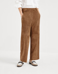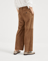 Luxurious suede adds a refined allure to these new Chino trousers. The garment features a boxy silhouette with a "cropped" cut that descends straight down the leg, a perfect balance between comfort and style. The velvety texture’s retro feel enhances the season’s color. MATERIALS Refined suede is a thin leather with a soft, velvety hand. DETAILS Zip closure with metal hooks and backing button Front pockets Back pockets with flap and button Half-lined REAL LEATHER