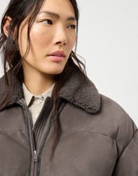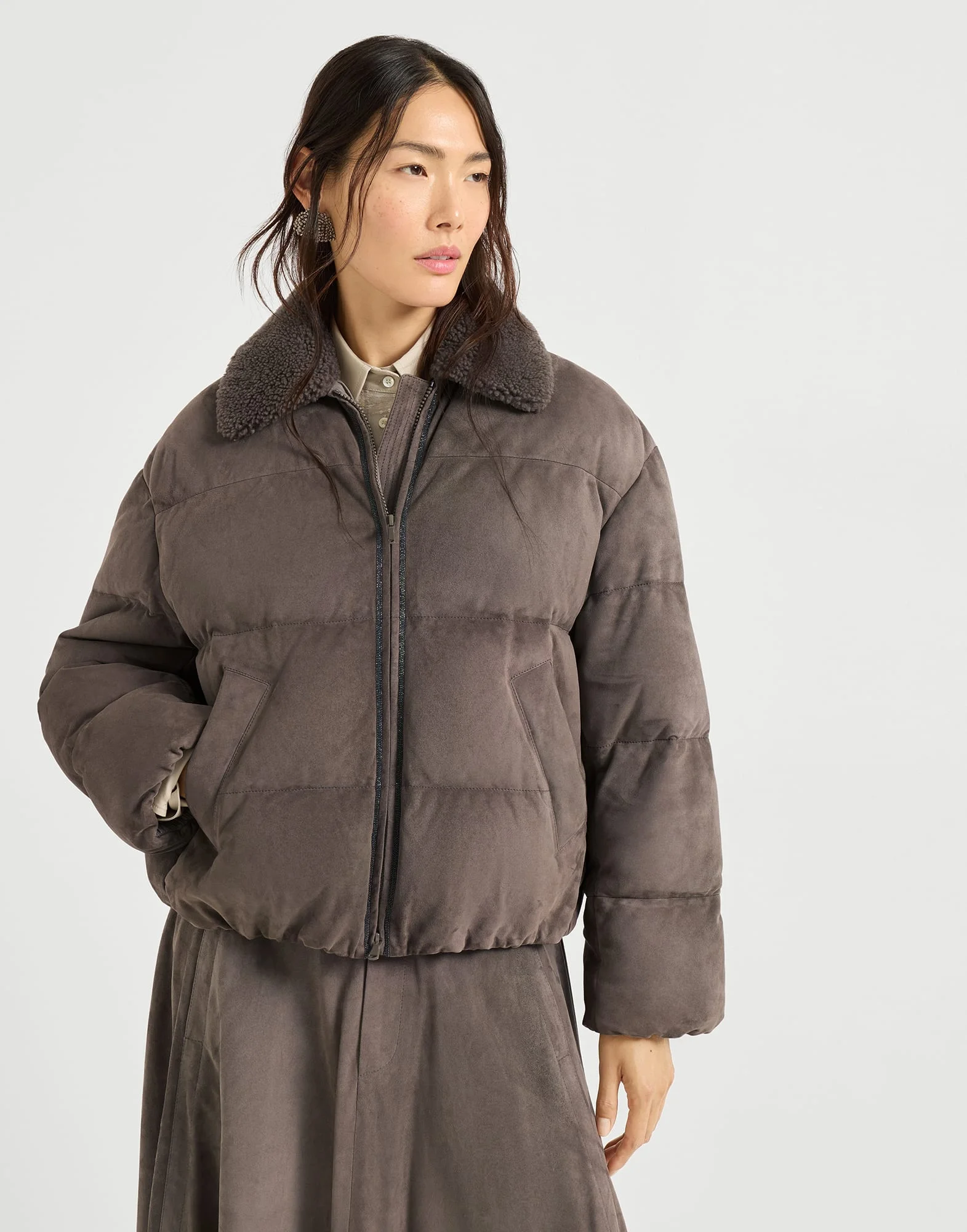 This new suede down jacket with merino shearling collar perfectly pairs a sporty attitude and precious details for a very feminine, urban style. The soft, velvety texture of suede accentuates the garment’s distinctly wintry feel, which is completed by a plush merino shearling collar that provides added warmth and a nice texture contrast. The shiny monili embroidery, the iconic embellishment of the Brunello Cucinelli collections, illuminates the zipper with a delicate sparkle. MATERIALS The style combines the velvety texture of suede and the soft, warm hand of refined merino shearling. All padding is certified according to the Responsible Down Standard (RDS). DETAILS Two-way zip closure Water-resistant nylon lining Collar with insert Hand pockets Cased elastic at cuffs and waistband Padding made from high-quality natural materials: 90% goose down, 10% goose feathers Nickel-free monili decoration REAL LEATHER