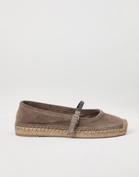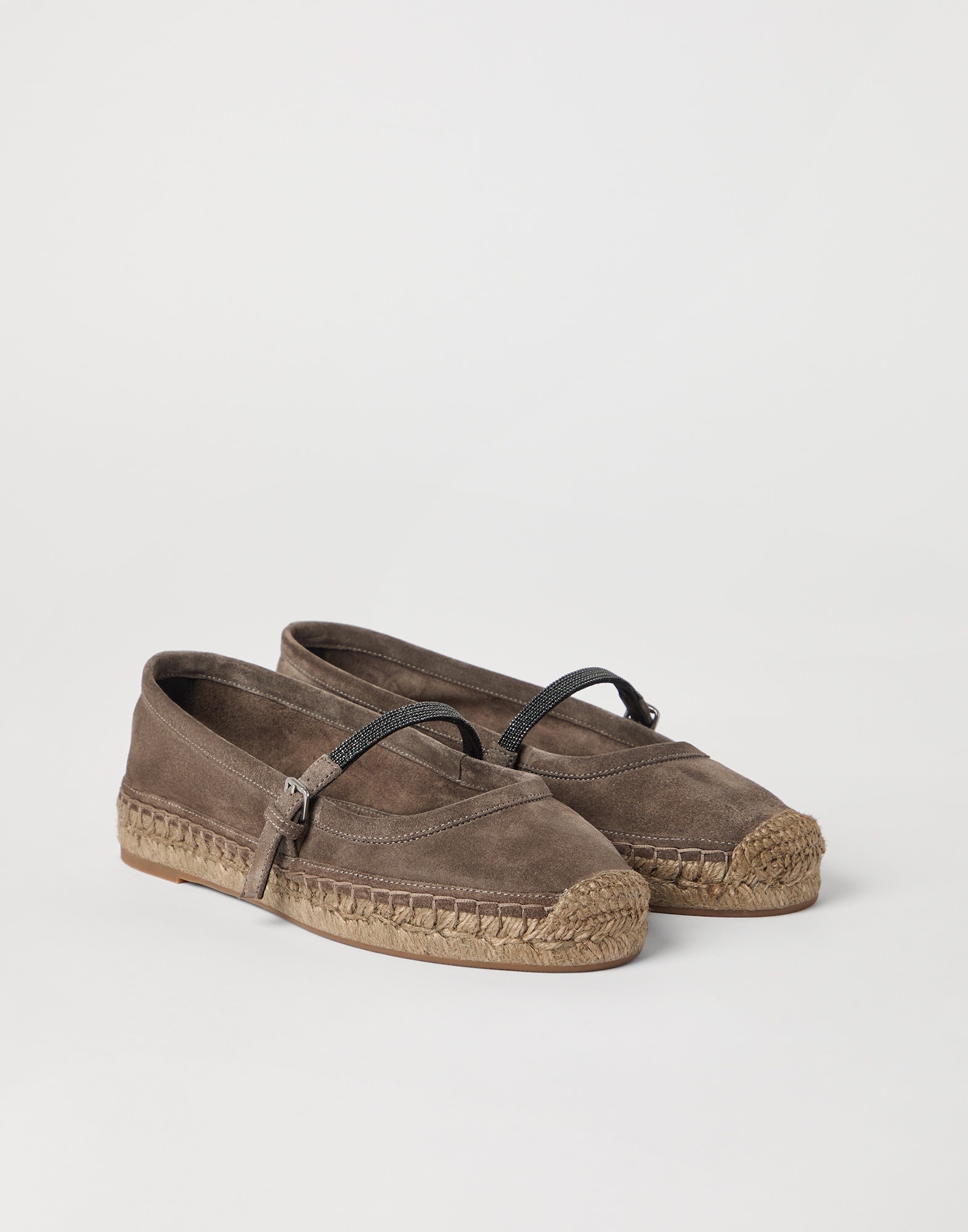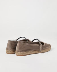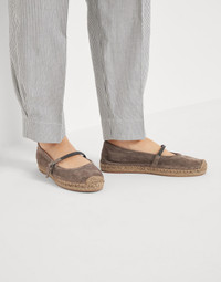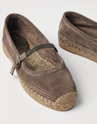 Precious details and texture contrasts update the iconic look of these espadrilles, a classic summer style. The refined suede adds a velvety touch to the design, while the adjustable strap in the front is made up of luxurious rows of shiny monili embroidery for a delicate sparkling note. The rope bottom creates an elegant contrast with the soft leather, while the rubber tread ensures a comfortable fit. MATERIALS Compact with a soft, velvety texture, the refined suede wraps the foot in a pleasant way. The rubber tread provides the fit with greater comfort. DETAILS Adjustable strap closure Suede lining Rope sole Lightweight rubber outsole Nickel-free monili decoration 100% REAL LEATHER