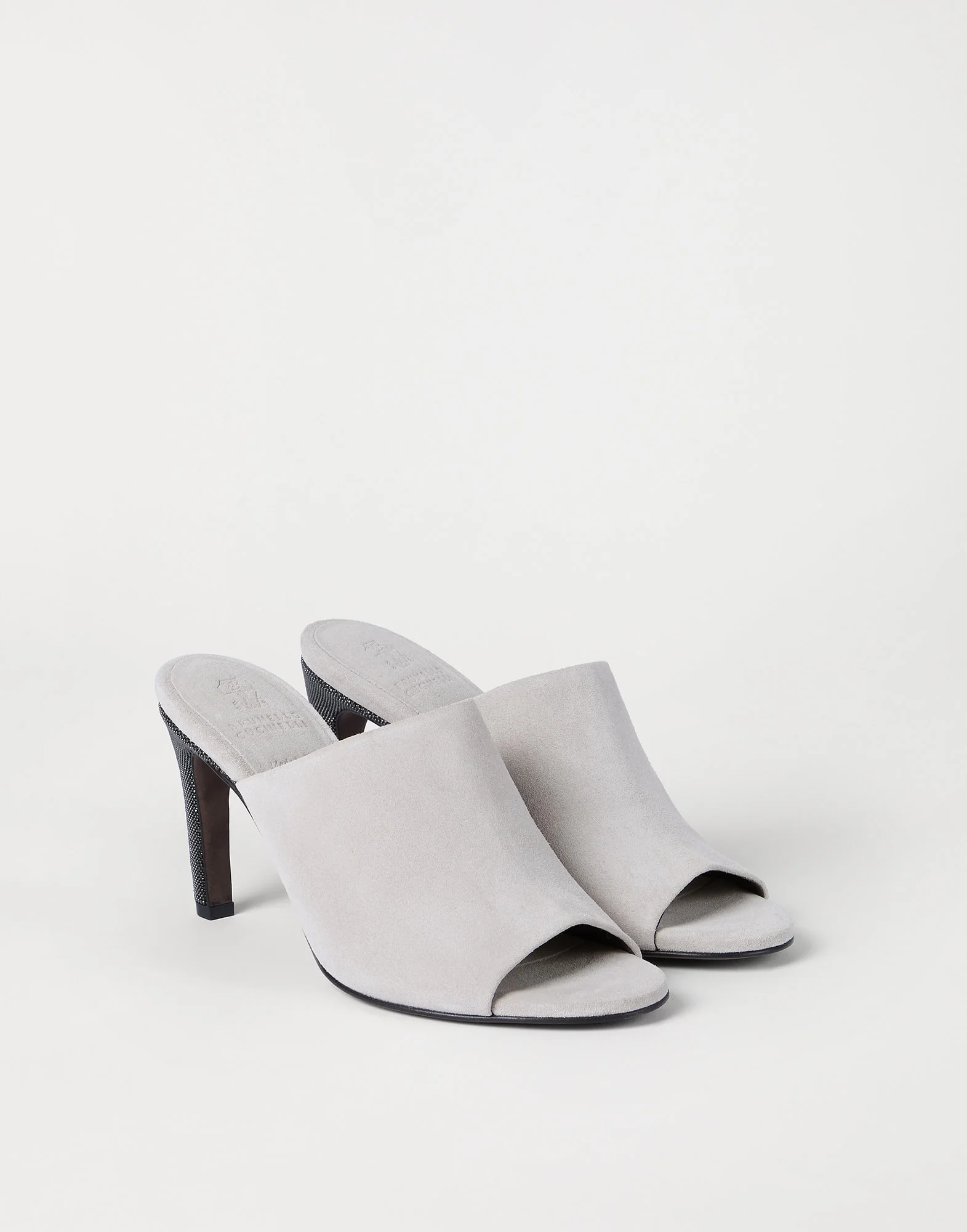 A mix of a feminine aesthetic and contemporary style defines these suede heels. Open in the back, the footwear features a comfortable, essential silhouette, complemented by the velvety touch of the refined leather. The shapely heel stands out for its curvature, which follows the natural shape of the foot’s heel, and is entirely covered with an iconic monili embroidery for an elegant sparkling note in true Brunello Cucinelli style. MATERIALS Refined suede is a thin leather with a soft, velvety hand. A thin leather outsole with a non-slip island provides the footwear with added comfort. DETAILS Leather lining Leather sole TPU rubber tread Non-slip TPU rubber at heel and toe Nickel-free monili decoration 8 cm (3.15") heel 100% REAL LEATHER