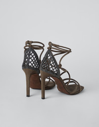 The mix of refined materials and special workmanship enhances the feminine silhouette of these suede heels. The thin straps that crisscross around the ankle are paired with the net-like structure featured on the heel counter, achieved using meticulous artisanal steps and entirely embroidered with rows of shiny monili for an iconic touch in true Brunello Cucinelli style. MATERIALS Refined suede is a thin leather with a soft, velvety hand. DETAILS Adjustable strap closure Suede lining Sole in leather and lightweight expanded polyurethane TPU rubber tread Non-slip rubber insert Nickel-free monili decoration 10 cm heel REAL LEATHER