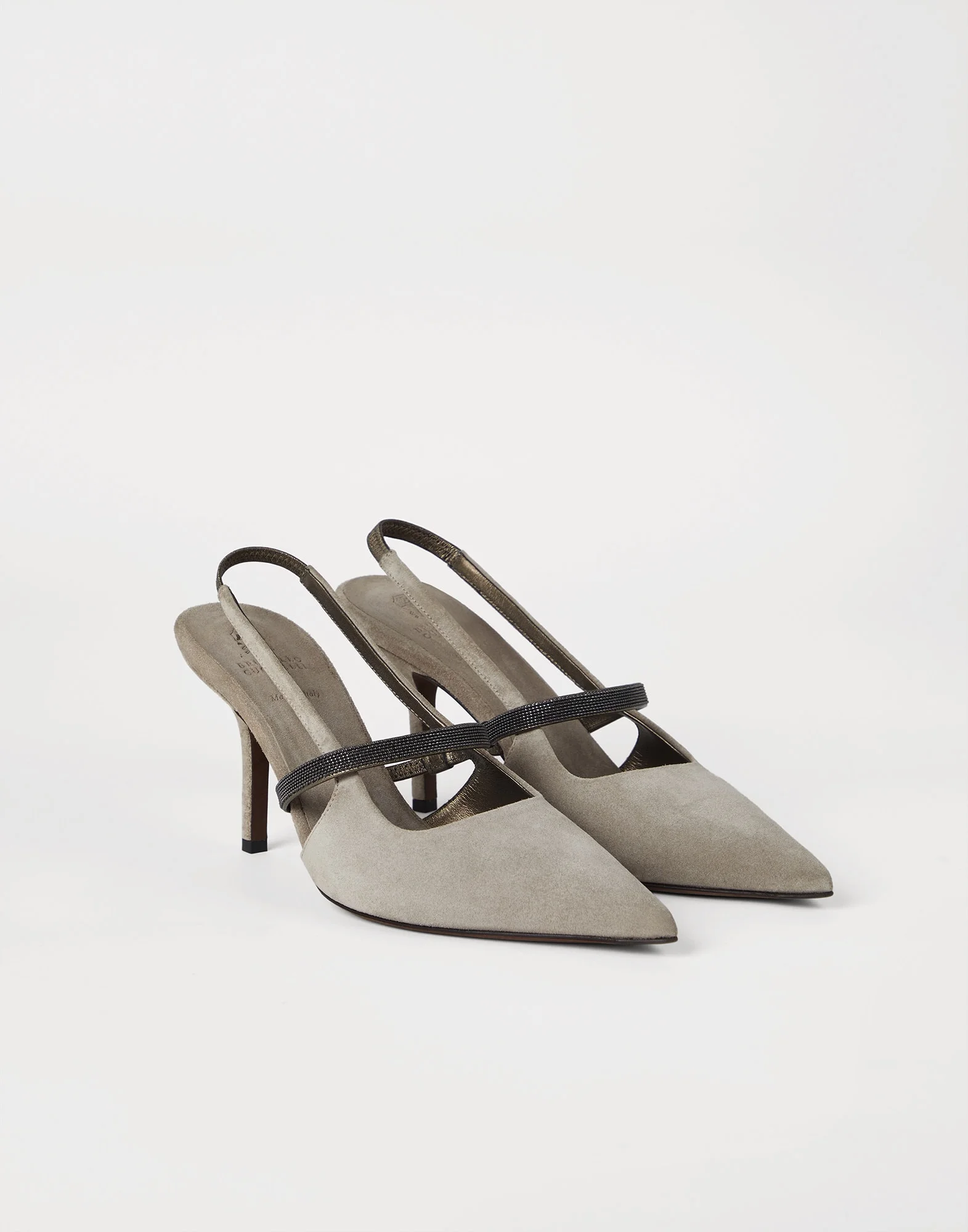 An elegant aesthetic, a contemporary design and sparkling details define these suede heels. This special leather gives a smooth and velvety appearance to the shoes, which elegantly pairs with their sinuous lines. The thin strap on the instep is brightened up by a shiny monili embroidery that enhances the feminine and stylish feel of the footwear. MATERIALS The refined suede is a compact leather with a soft, velvety texture. DETAILS Elastic insert at heel for greater comfort Suede lining Leather sole Non-slip TPU rubber at heel and toe Nickel-free monili decoration 8 cm (3.15") heel REAL LEATHER