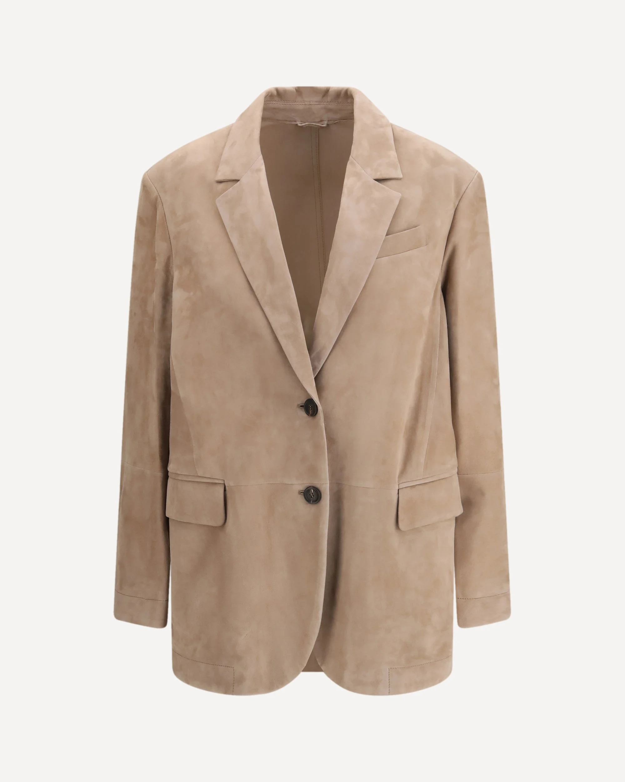 The suede Jacket with monile by Brunello Cucinelli blends refined materials with the brand’s signature sartorial elegance. Its soft, velvety suede enhances the season’s hues with a subtle, matte iridescence, while the single-breasted closure gently defines the waist, creating a distinctly feminine silhouette. Peak lapels and flap pockets nod to classic menswear tailoring, reinterpreted with contemporary finesse. A delicate embroidery of luminous, nickel-free monile an iconic Brunello Cucinelli detail adds a refined, unexpected touch of light to the piece. DETAILS - Sku: MPCAI7366_C4191 - Season: SS26 - Fit: Slim - Composition: GENERAL 100% Calf Leather Bos Taurus - MADE IN ITALY