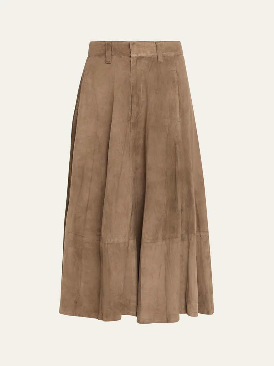 Brunello Cucinelli skirt is crafted of a flowy soft lamb suede High waist Hip welt pockets Hem falls below the knee Circle silhouette Hook/zip fly; belt loops Suede Lining: Acetate/polyester Dry clean Made in Italy Online Inquiries: BGS21_BABZ9| Store Inquiries: #5077362