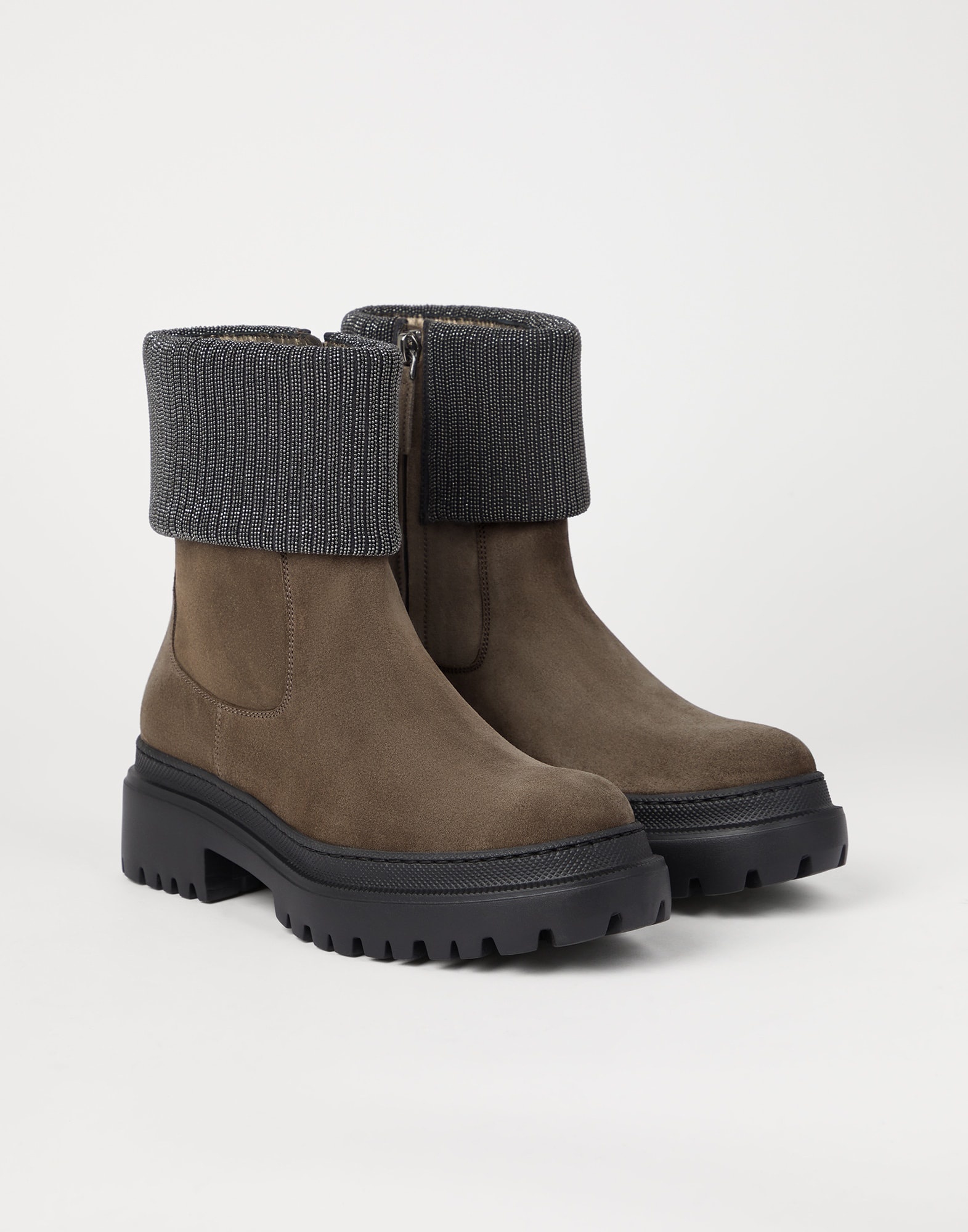 Details with a feminine feel pair perfectly with the sporty inspiration of these new Chelsea Boots. The cuff is embellished with a refined ribbed embroidery in shiny monili, enriching the footwear’s essential silhouette, showcased in ultra-soft suede. The rubber lug outsole provides a bold touch, while accentuating the comfortable fit. MATERIALS Refined suede is a compact leather with a soft, velvety texture. A leather lining and an ultra lightweight rubber bottom provide the fit with added comfort. DETAILS Internal side zip closure Rubber outsole TPU rubber tread Nickel-free monili decoration REAL LEATHER