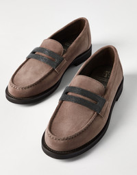 Refined materials and sparkling embellishments reinterpret the masculine style of these penny loafers in an elegant, contemporary way. The velvety texture of suede gives the footwear a sophisticated touch and enhances the season’s colors. Embroidered entirely by hand, the precious monili band adds an iconic, feminine note in true Brunello Cucinelli style. MATERIALS The refined suede is a compact leather with a soft, velvety texture. DETAILS Leather lining Sole and tread in lightweight micro rubber Nickel-free monili decoration REAL LEATHER