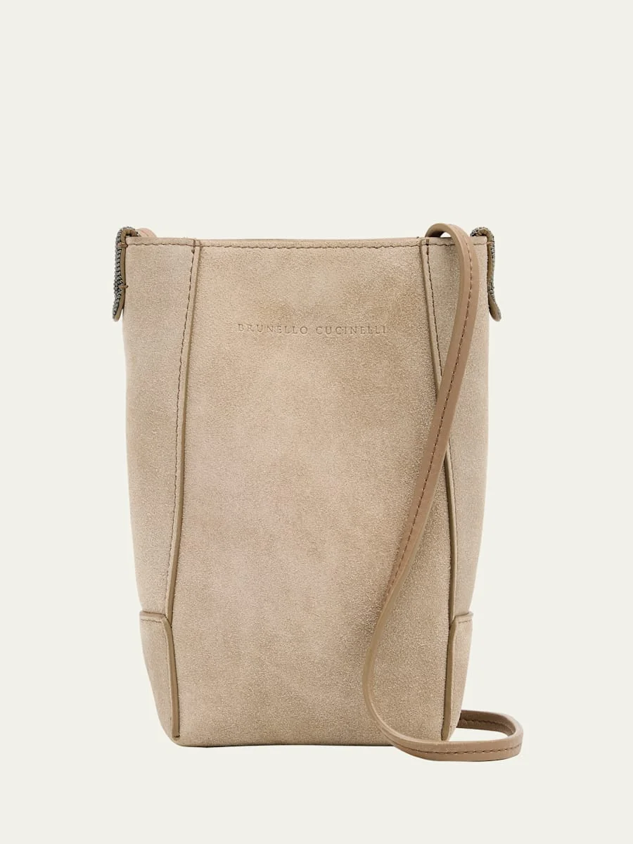 Brunello Cucinelli phone crossbody bag in suede with Monili trim Crossbody strap Open top with magnetic closure Interior, one slip pocket Approx. 7.5"H x 5.5"W x 2"D Made in Italy