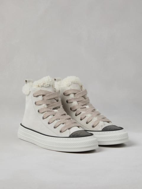 Refined materials and iconic details characterize these new suede sneakers. Their velvety texture brings out the color of the season, while the label in shiny monili, the iconic embellishment of the Brunello Cucinelli collections, adds a sparkling note. The cotton-blend fabric lining and the rubber outsole provide the fit with added comfort. MATERIALS The light, velvety texture of suede is combined with a shiny monili detail. A cotton-blend lining and an ultra lightweight EVA bottom provide added comfort. DETAILS Flat cashmere laces Water-resistant cotton-blend fabric lining Sole in lightweight micro rubber TPU rubber tread Nickel-free monili decoration REAL LEATHER