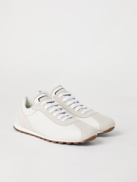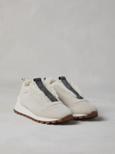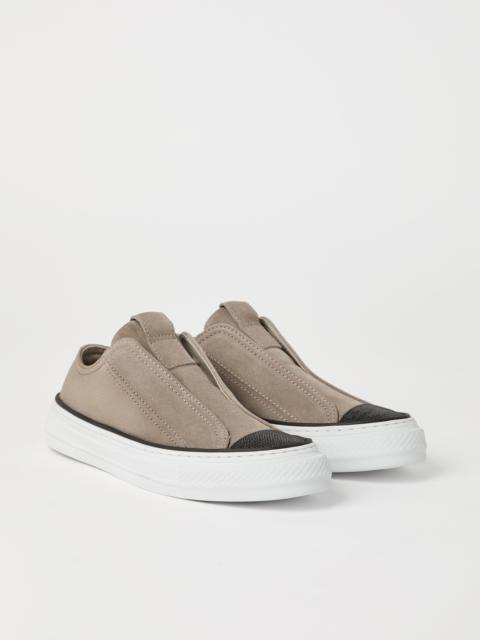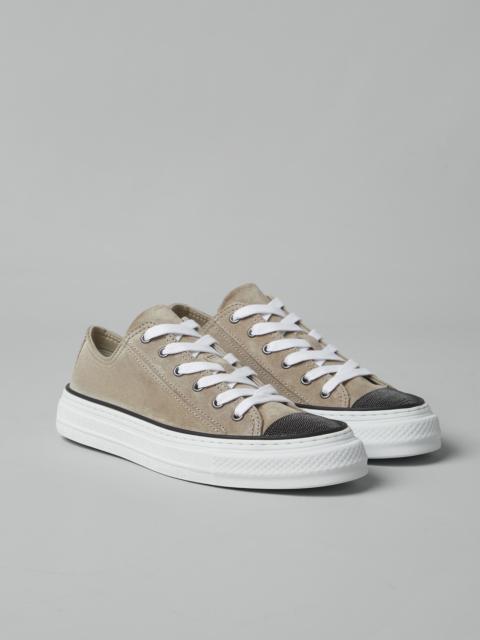 Refined materials and iconic details characterize these new suede sneakers. Their velvety texture brings out the color of the season that contrasts with the laces and the tag in shiny monili, the iconic embellishment of the Brunello Cucinelli collections. The cotton-blend fabric lining and the rubber outsole provide the fit with added comfort. MATERIALS The light, velvety texture of suede is combined with sparkling bands in shiny monili. A cotton-blend lining and an ultra lightweight EVA bottom provide added comfort. DETAILS Flat cotton laces Fabric lining Sole in lightweight micro rubber TPU rubber tread Nickel-free monili decoration REAL LEATHER