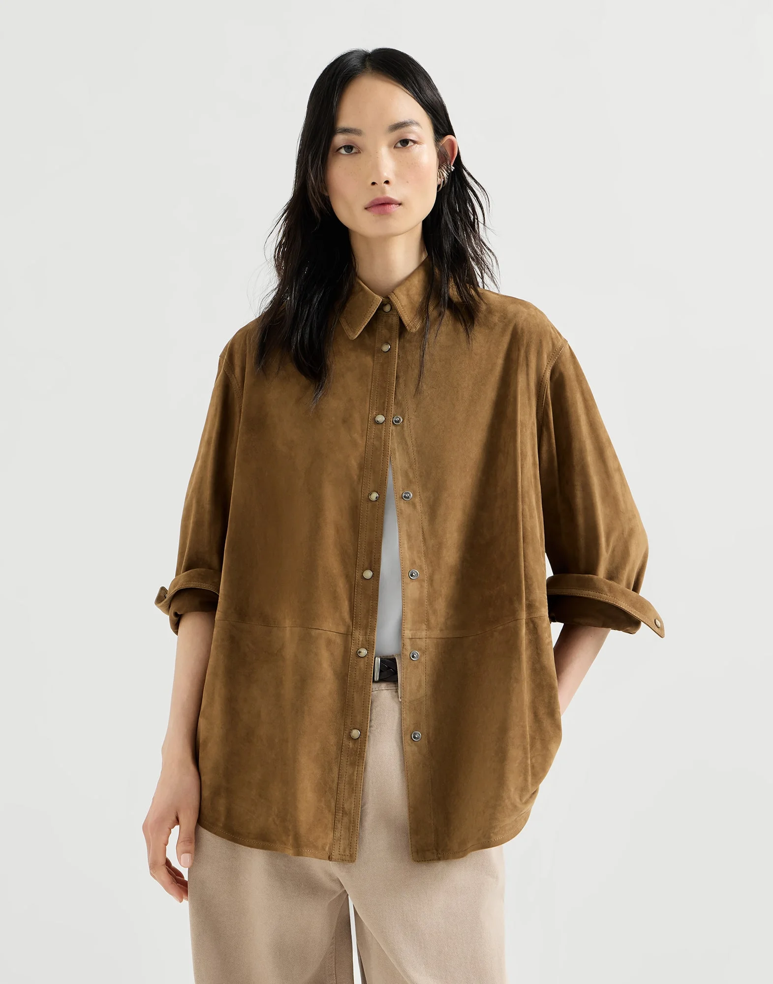 Refined Brunello Cucinelli materials revisit the tradition of shirting in this new suede shirt. With an extremely soft hand, the sophisticated leather updates the essential nature of the classic shirt silhouette, characterized by slightly oversized proportions for a relaxed appearance. The iconic monili embroidery completes the design with a delicate sparkle. MATERIALS Refined suede is a thin leather with a soft, velvety hand. DETAILS Horn button closure Classic collar Cuffs have two horn buttons Nickel-free monili decoration 100% REAL LEATHER