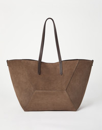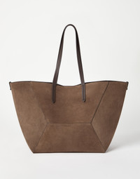 The large suede BC Duo bag reinterprets the classic "everyday bag" in true Brunello Cucinelli style. Ultra-soft and compact, the suede enhances the season’s colors and enriches the geometric silhouette, highlighted by bold stitching that emphasizes the squared, minimal lines. A removable internal zipper pouch and the practical magnetic closure complete the style, while two monili embroideries add a feminine sparkling note. If fastened, the internal ties on the sides allow the shape of the bag to change, making it more compact. MATERIALS The refined suede is a compact leather with a soft, velvety texture. A leather lining completes the look of the bag. DETAILS Magnetic snap closure Double handle Leather lining Detachable internal pochette with zipper Nickel-free monili decoration Bag is 62 cm (24,41") long, 29 cm (11,42") wide and 32 cm (12,60") high 100% REAL LEATHER