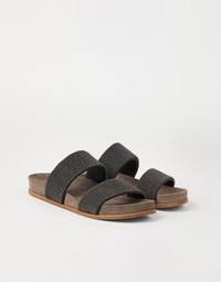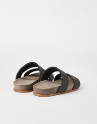Contemporary, urban styling characterizes these new suede slides. The shoes feature two straps entirely embroidered in monili, the iconic decoration of the Brunello Cucinelli collections, which add a radiant, sparkling touch to the design. MATERIALS The refined suede is a compact leather with a soft, velvety texture. The leather outsole and lightweight micro tread provide added comfort when worn. DETAILS Leather lining Leather sole Lightweight rubber outsole Nickel-free monili decoration 100% COTTON
