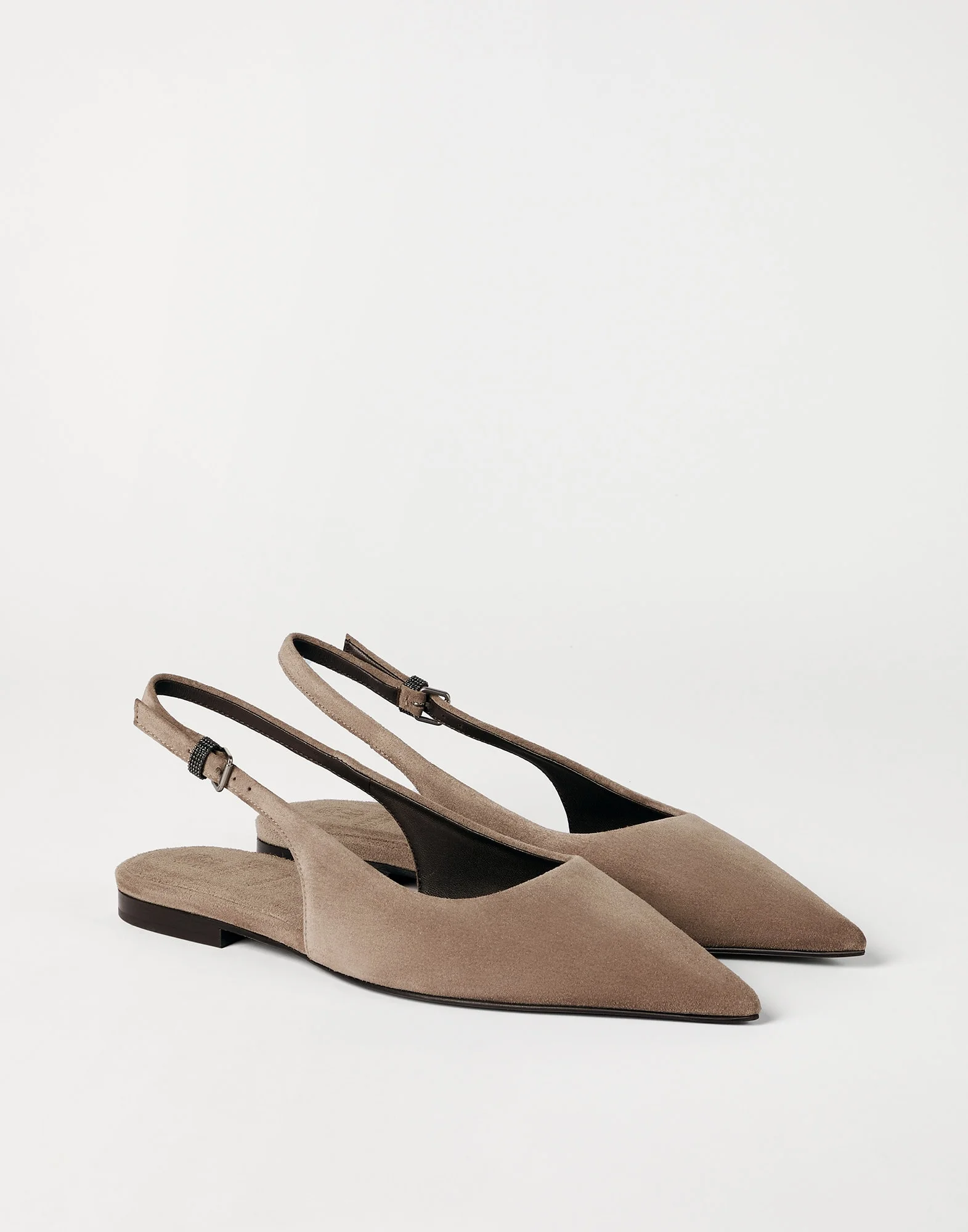 An essential silhouette and refined materials come together in these suede slingback flats. The very feminine design features a slightly tapered toe and a particular square throat. The shapely heel stands out for its curvature, which follows the natural shape of the foot’s heel, and is entirely covered with an iconic monili embroidery for an elegant sparkling note in true Brunello Cucinelli style. The rear elastic strap provides the fit with added comfort. MATERIALS Refined suede is a thin leather with a soft, velvety hand. A thin leather outsole with a non-slip island provides the footwear with added comfort. DETAILS Leather lining Adjustable strap closure TPU rubber tread Non-slip TPU rubber at heel and toe Nickel-free monili decoration The heel height measures 1 cm (0.39") 100% REAL LEATHER