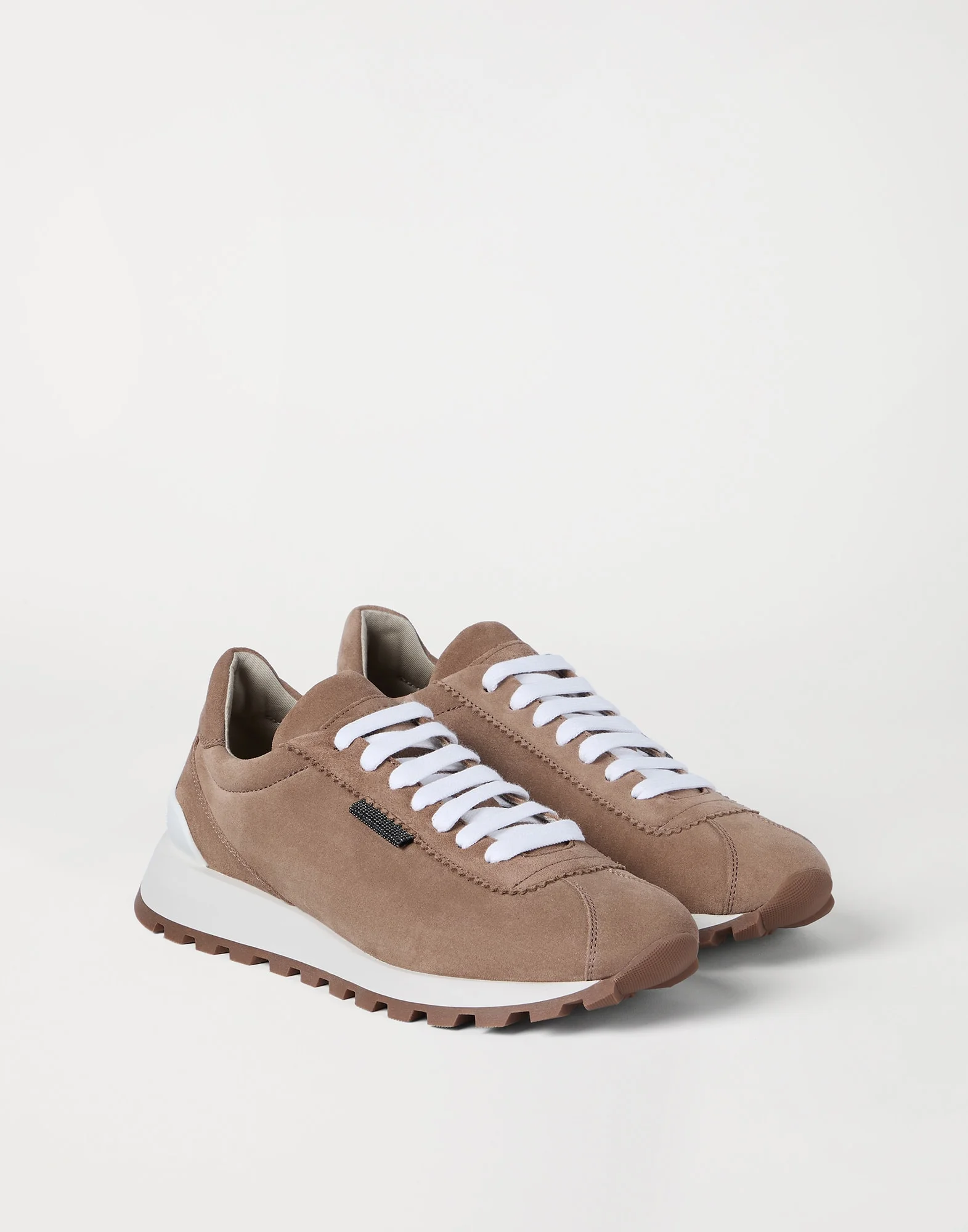 Refined materials and iconic details characterize these new suede sneakers. Their velvety texture brings out the color of the season that contrasts with the laces and the tag in shiny monili, the iconic embellishment of the Brunello Cucinelli collections. The cotton-blend fabric lining and the rubber outsole provide the fit with added comfort. MATERIALS The light, velvety texture of suede is combined with sparkling bands in shiny monili. A cotton-blend lining and an ultra lightweight EVA bottom provide added comfort. DETAILS Flat cotton laces Fabric lining Sole in lightweight micro rubber TPU rubber tread Nickel-free monili decoration 100% REAL LEATHER