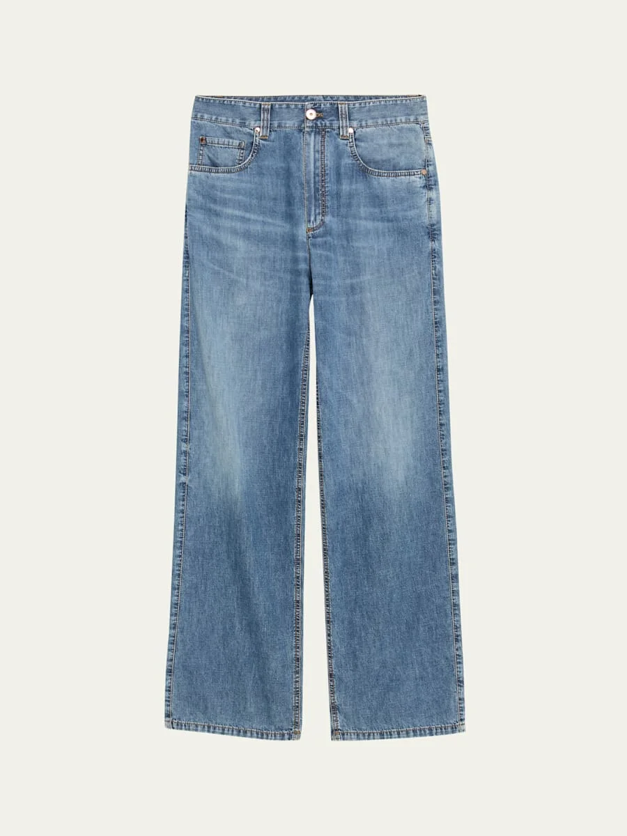 Brunello Cucinelli contemporary jeans are crafted from super lightweight lightwashed denim accented with fading, whiskering, and signature monili trim on the back belt Mid rise sits high on hip Fivepocket style Relaxed straight legs Full length Button/zip fly; belt loops Cotton Made in Italy