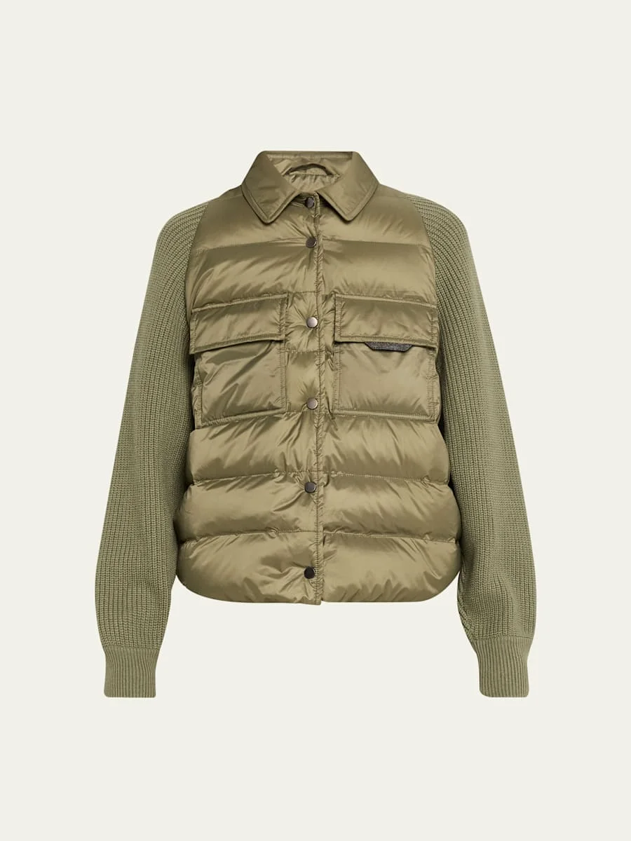 Brunello Cucinelli down padded jacket is crafted from a technical taffeta bodice and woolcashmereblend knit sleeves combo accented with a monili tab on the chest pocket Point collar; snap front Long raglan sleeves; ribbed cuffs Chest flap pockets Relaxed fit Hip length Nylon/polyester/virgin wool/cashmere Fill: Down Made in Italy