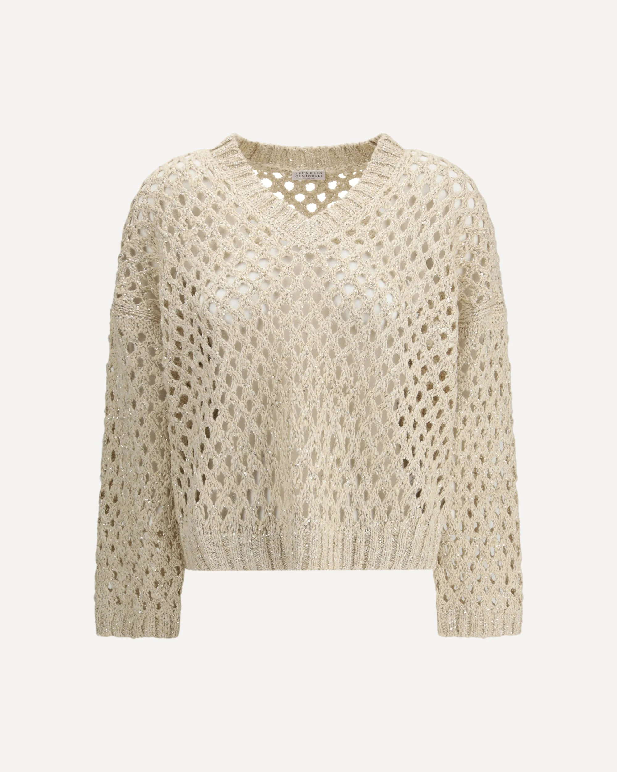 The Jumper by Brunello Cucinelli reveals refined femininity through the Dazzling Net construction, where silk and linen blend to create a natural yet sophisticated texture. The signature net structure is enriched with subtle sequins that bring gentle light reflections across the surface. The V-neckline, dropped shoulder and wide sleeve shape a harmonious silhouette, while the ribbed trims complete the piece with measured balance. The addition of a cotton thread adorned with sequins enhances the natural fibers with a luminous touch, highlighting the craftsmanship and thoughtful design behind each creation. DETAILS - Sku: MEA338202P_CBU80 - Season: AW25 - Fit: Regular - Composition: GENERAL 36% Silk 34% Linen 17% Polyamide 13% Polyester - MADE IN ITALY